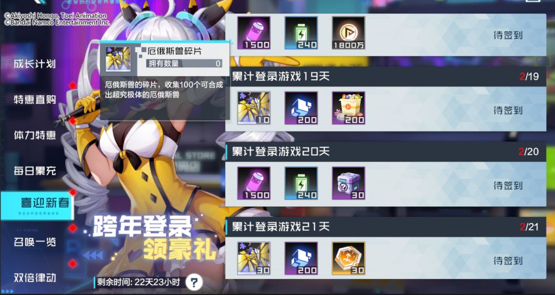 新年签到收获好礼,这次策划大大可是放大招了哦~完成累计签到不仅有豪礼相送,更能获得25资质超究极体厄俄斯兽!