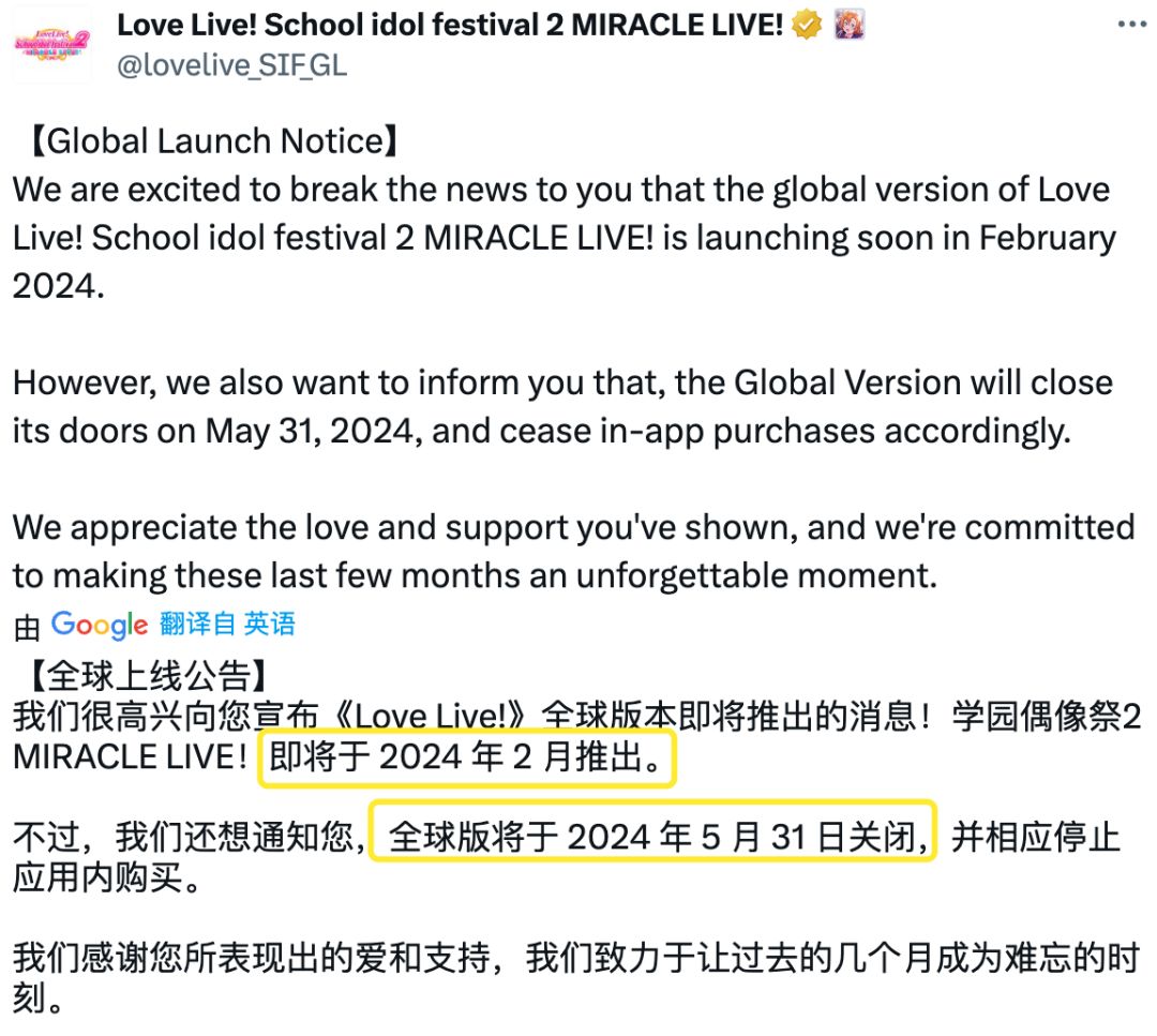 上线不到一年,《LoveLive! 学园偶像祭2》宣布3月31日关服
