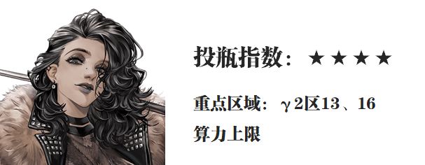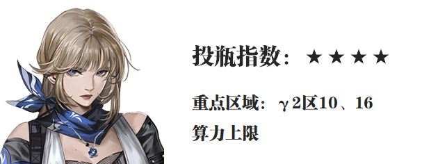 第四位是芙烈达,这里给到的投瓶指数为4颗星,是属于值得投资的对象,虽然说不少玩家都觉得芙烈达就是那一拨爆发回合爽翻,其余时间则相对较为平疾,但她对于很多关卡需要“极速”通关的目标来讲依然是有很高不可替代性的,所以在γ1区中的AP上限提升、最佳射程增伤、命中率提升,还有γ2区中的躯干增伤等效果都是芙烈达比较需要的增益点,所以综合来讲芙烈达也算是一位投资不会亏的主C,部分玩家目前提倡的10+4等算力搭配也是可以考虑。
