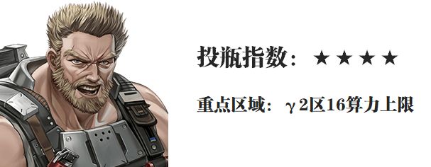 第八位马库斯,γ2区后续的高算力上限效果还是不错的,增伤+减AP+再移动等多个优秀的功能也是共聚一堂,只是γ区低算力上限的部分效果和马库斯的天赋无法共存显得有点遗憾,当然可以共存的话......那马库斯就有点逆天了,综合还是给个4星的投瓶指数吧,投资的回报很是优秀!