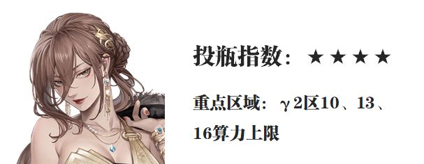 第十位娜塔莉亚,γ区的多个效果对她的增益也是肉眼可见,例如γ2区中的10、13算力在激活后娜塔的AP会......呈现相当之高的回复效率,特别是γ2区16算力上限的躯干增伤也是一个比较重要的buff效果,对于娜塔这种重炮手来讲非常适配,考虑到娜塔目前的综合上场价值,权衡下维一还是给了4星的投瓶指数,常常把娜塔当成主力的朋友可以多多考虑。