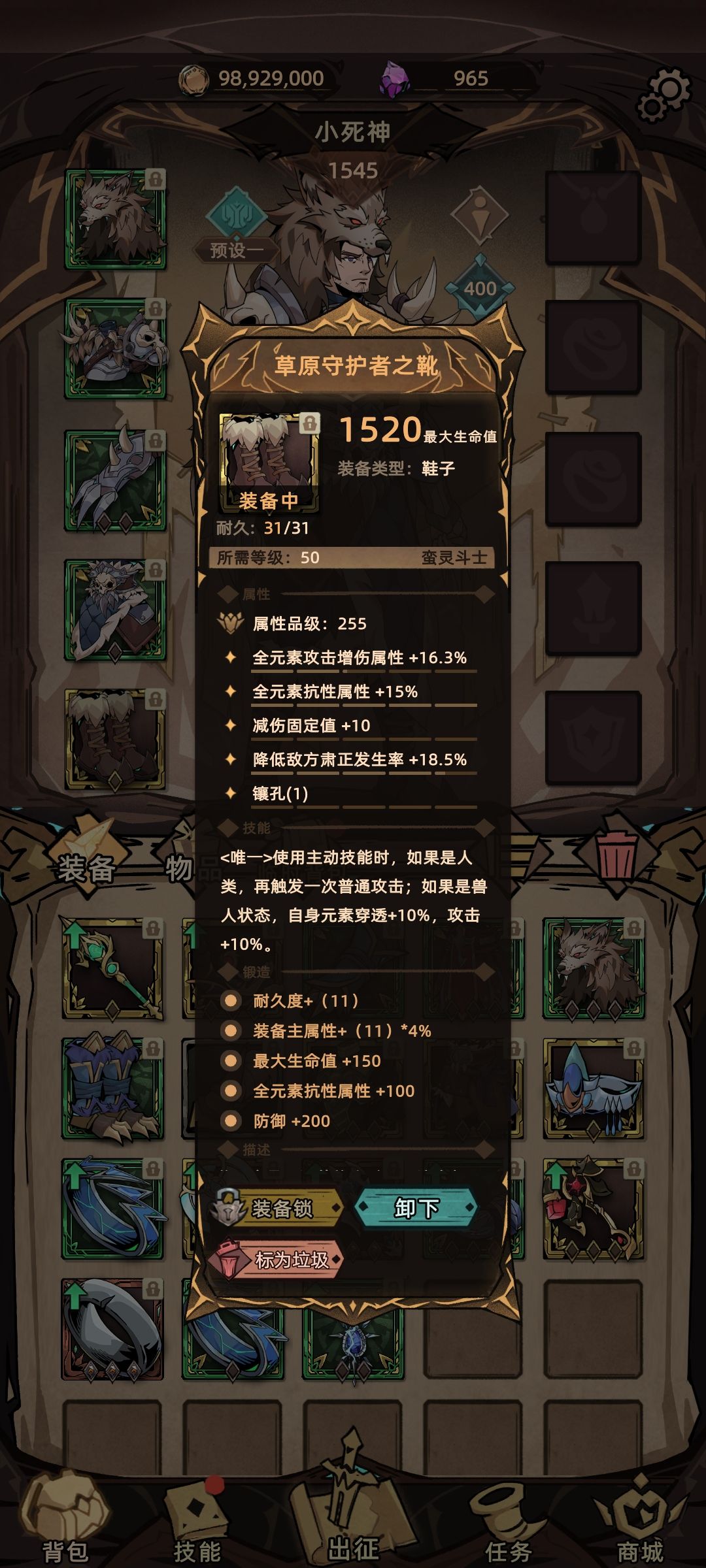 既然我们通过神器+3个升阶套装+暗金鞋子【草原守护者之靴】+暗金武器【远古荣耀】达到了永晕的效果,那么就可以用百分比伤害打死所有的怪物。有吗?有的!