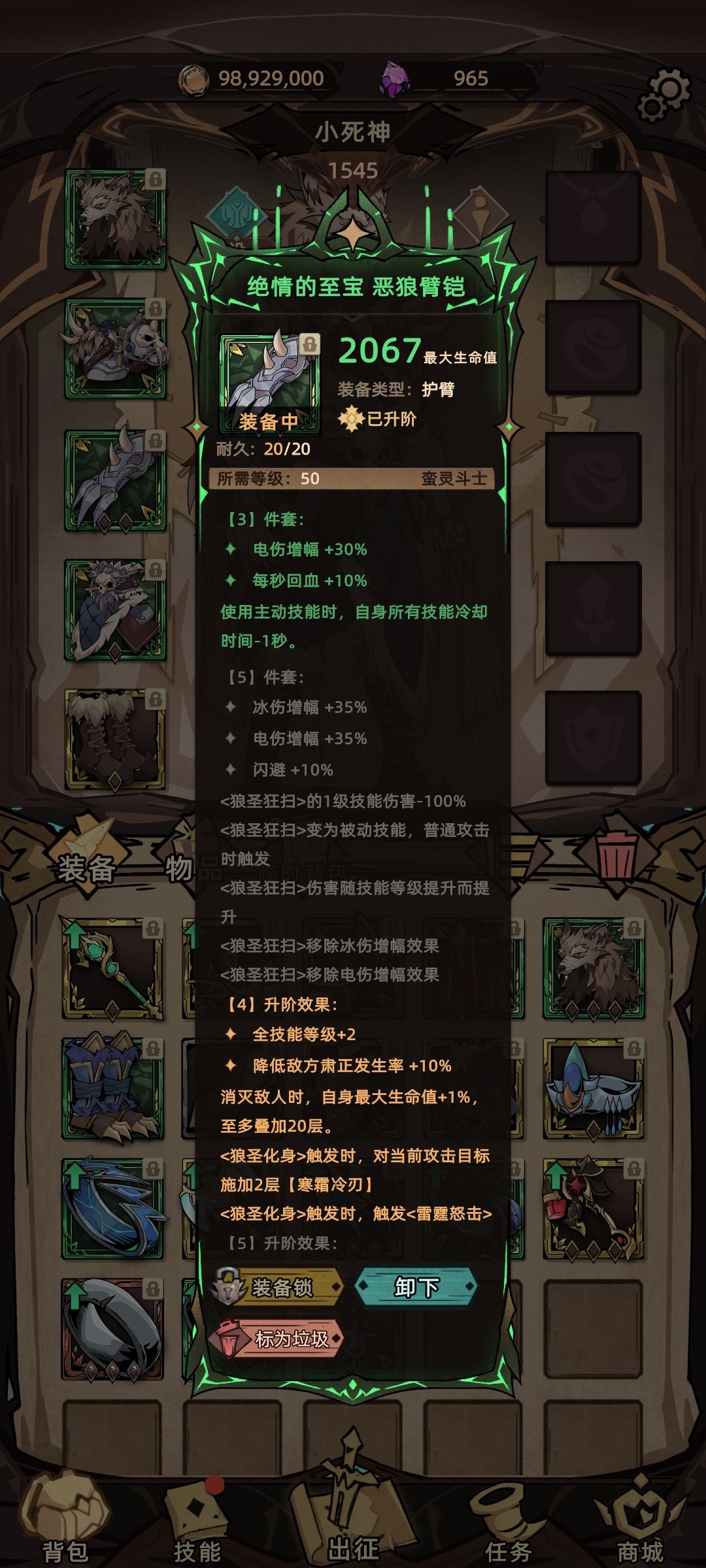 所有装备的词条和我上期的基本一致,还是堆生命值。但是这个因为少了<幻化狼形>的50%暴击率,所以项链要优先堆满暴击率。