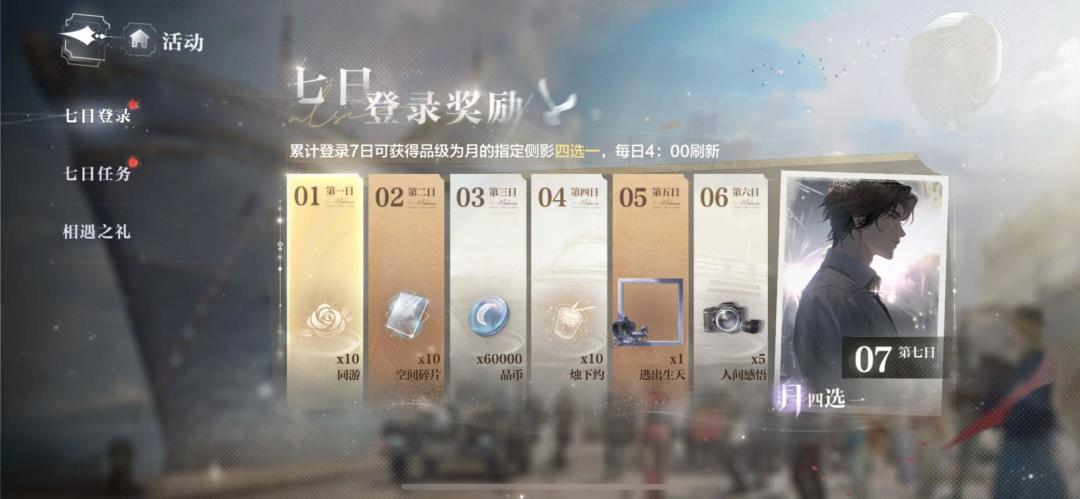 ①七日登录奖励:同游*10+空间碎片*10+晶币*6w+烛下约*10+「逃出生天」定制头像框+人间感悟*5+自选「侧影·月」