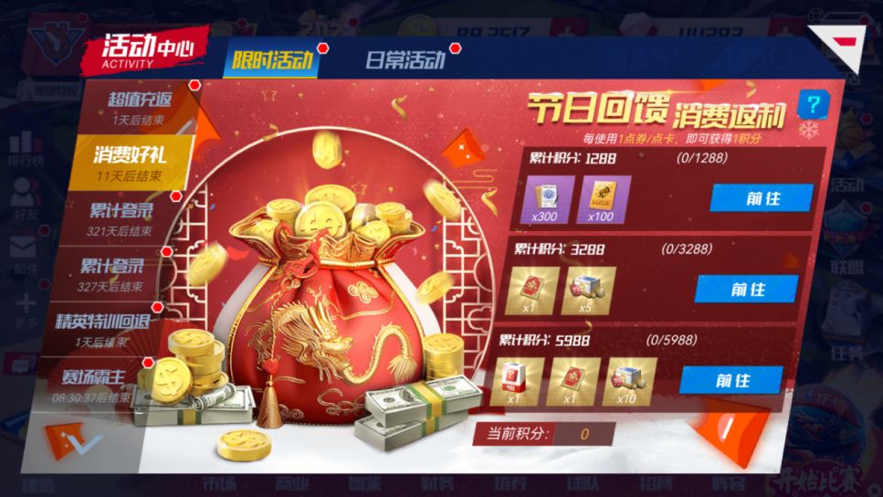 新春超级回馈!累计消费可获超值好礼!累计消费5988可获得共计2个默契定向书、15个三星徽章自选礼盒、1个8级战术书礼盒等,更多惊喜好礼快来参与吧!