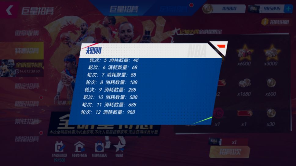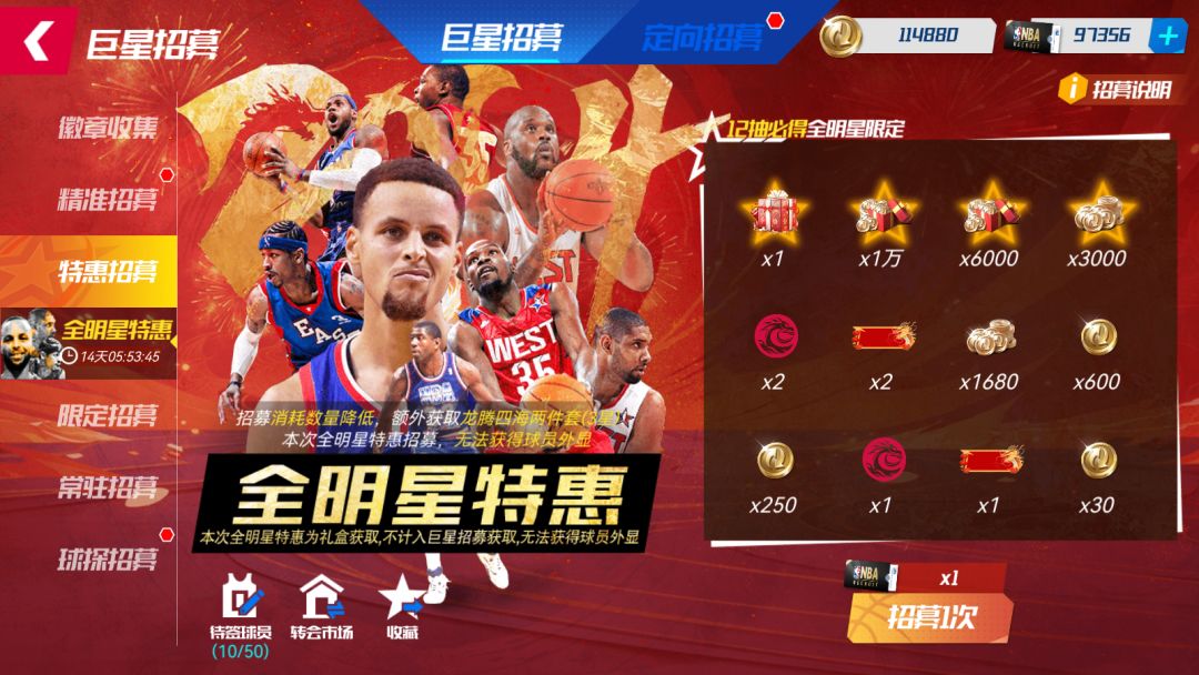 TIPS:本次全明星特惠为礼盒获取,不计入巨星招募获取,无法获得球员外显,全明星球员可以在自由市场售卖。