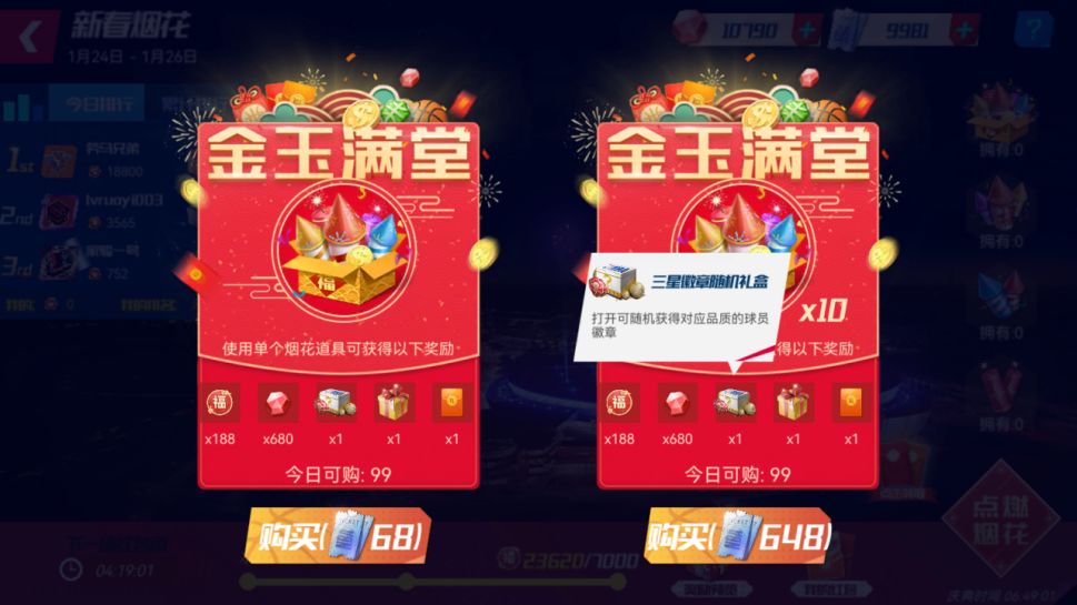 使用【金玉满堂】烟花道具,可以获得【三星徽章随机礼盒】!祝福值在本服排名前十的经理人可以获得“手感火热”球员光环,全服排名前一百的经理人还可获得稀有限时称号“飞龙在天”,前三名可获得6个“飞龙在天”称号,称号时间可叠加使用!让我们相约新春之夜,共享球场的绚烂烟火!
