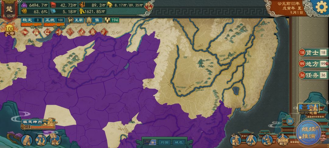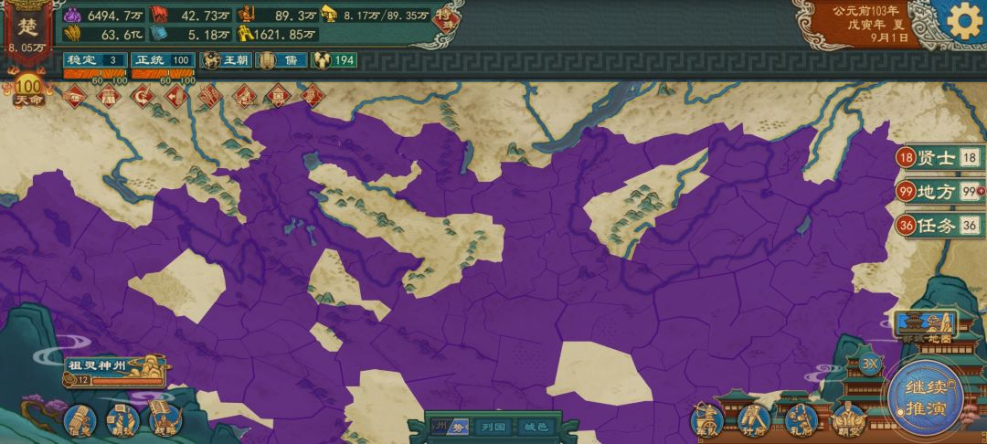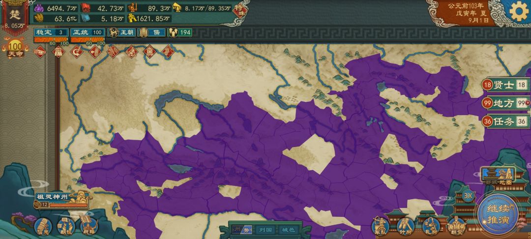 下面我说一下攻略,很多城池是隐藏的,自己和分封的诸侯是不具备开发功能的,所以不能直接打,一开始的两局灭了那些城池就隐藏了,目前不清楚隐藏城池出来的条件是发展度,还是时间线,只能让AI去开发,还有个要注意的,就是要让AI发展,荒漠城池只有AI能发展起来,自己去开发一两年就荒废了,而且分封也不行,不过我觉得可以把政策改为匈奴文化,分账的话就可以自己开发,目前没试过,匈奴和西域的方法就是威压一个,让后统一天下让他打赢,就可以了