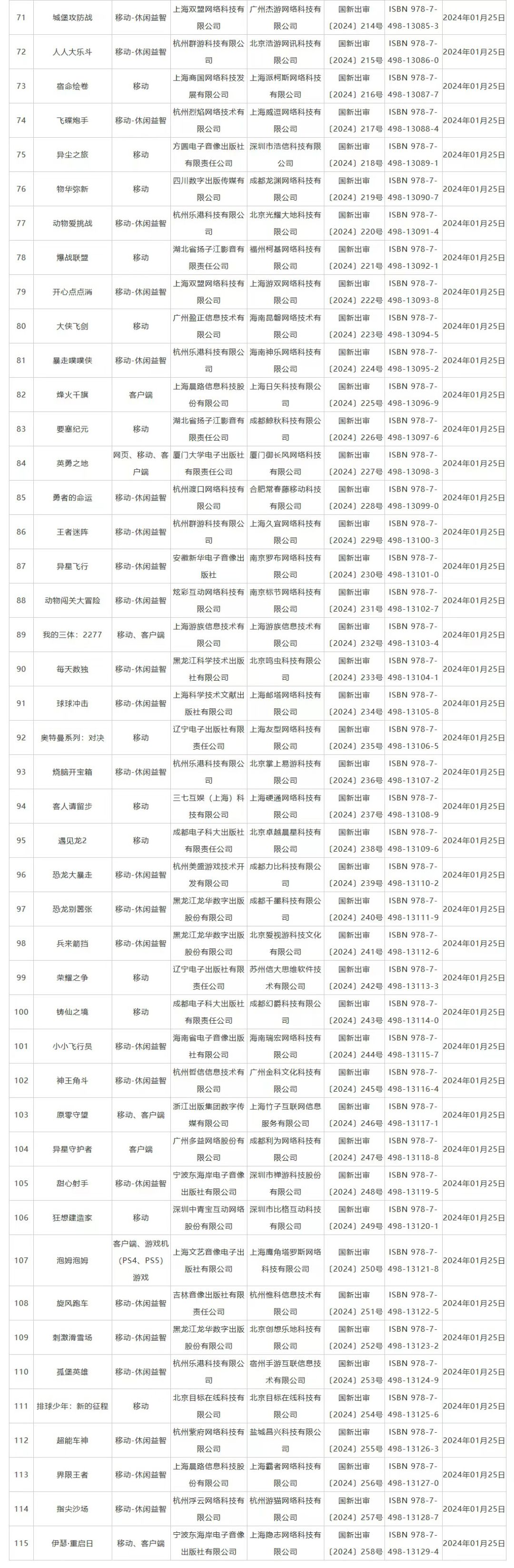 )这批共115款,包括《假未来》《泡姆泡姆》《水银疗养院》《我的三体:2277》《伊瑟·重启日》《侠客风云传前传》等移动端或客户端的版号。