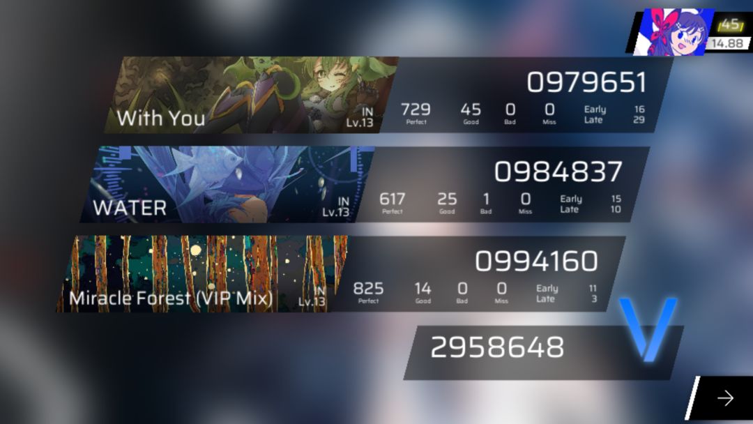 有的人认为总分就能代表你这三首歌的平均水平。这看上去很合理。那接下来我举一个例子:一个rks11的人,选两首1级的歌和一首魔王,两首低级歌每首98万分,魔王68万分,平均每首88万分,按照上面的逻辑这三首歌的平均水平就是88%。这一听就很扯吧。那又有人说,严判成绩决定的是你打这几首歌等级加起来再平均以后的水平,这样总对了吧?还是不全面。还是上面的例子,三首歌加起来十七八级(rks11很难解16级关卡),平均下来6级歌曲每首88%。这貌似更扯。那么什么样的说法才是相对正确的呢?