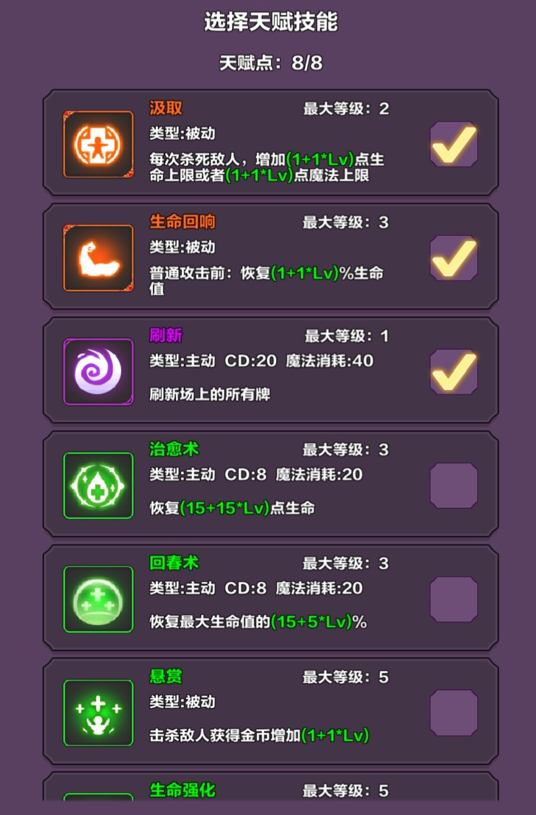 开局技能选择:汲取,生命回响,刷新。