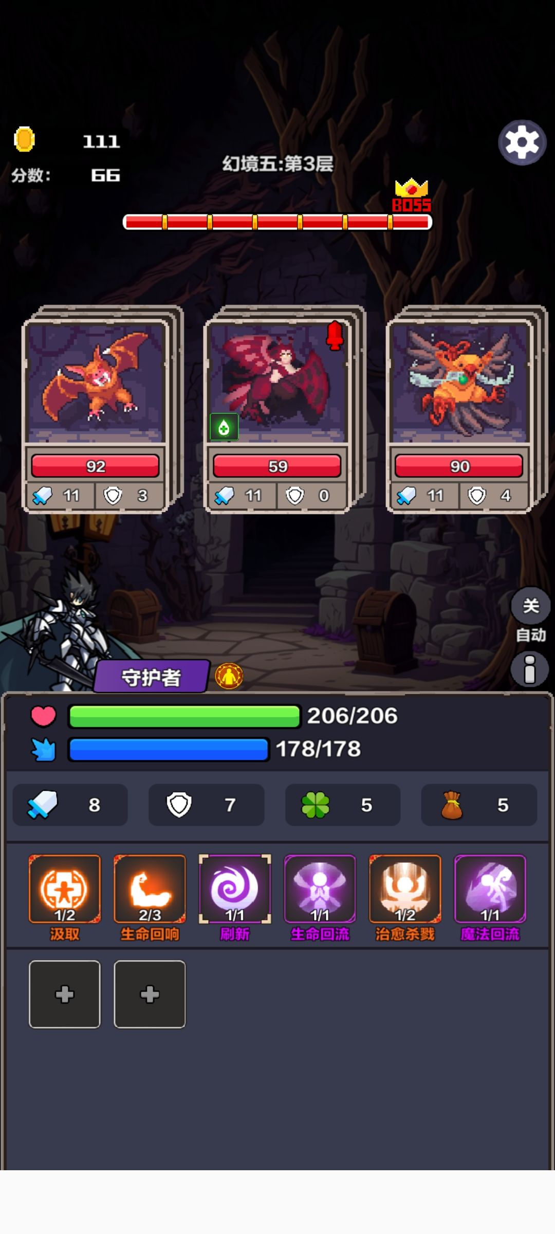 每次打怪都别打死,只要【刷新】冷却了就直接使用,直到出现属性卡和神秘事件为止。属性卡优先级:生命>防御>四叶草;神秘事件:升级技能>开技能槽。