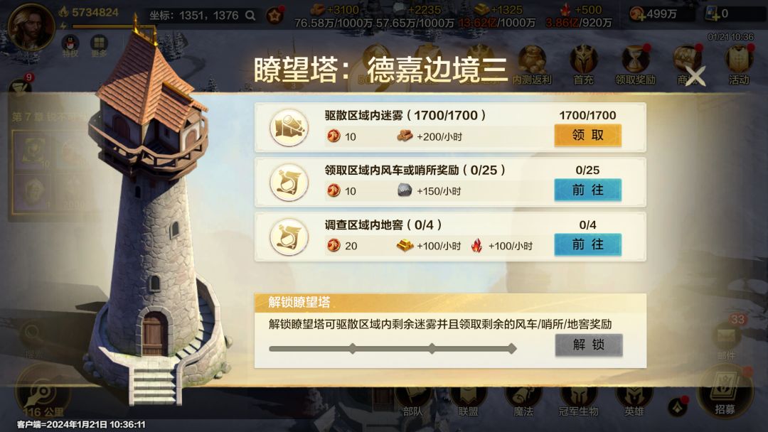 ②瞭望塔地图上分布着诸多瞭望塔建筑,派遣斥候前往探查,完成瞭望塔任务后,即可获得对应资源产出提升。
