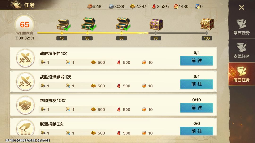 每日任务:日常任务,每日刷新,完成任务可以获得黄金和水晶资源奖励,通过积累活跃度,开启宝箱也会获得更多资源奖励。