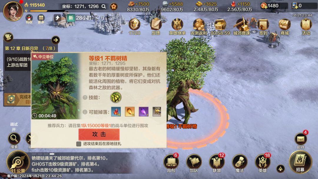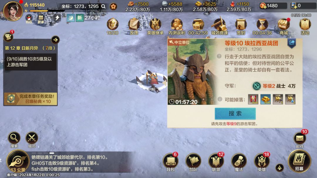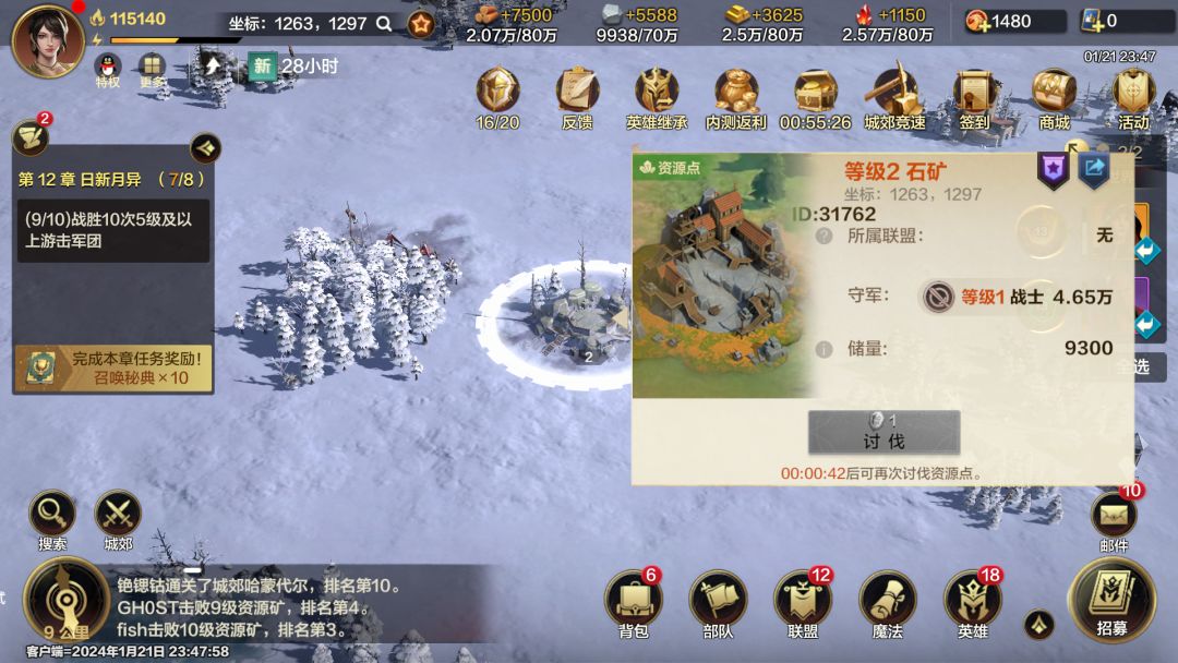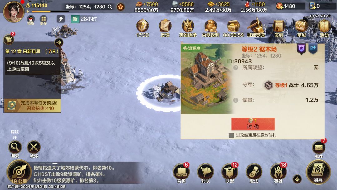 ①主城产出点击英雄征程,可以进入城郊副本挑战,击败资源点守军,收回相应资源点,可以提升相应资源产量,每完成一个章节,也会大幅提高主城资源产出。