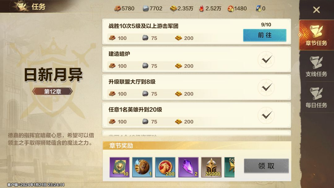 任务产出任务获取途径分为:章节任务、支线任务、每日任务,完成任务也会获得相应资源。章节任务:玩家完成每章节指定任务,即可获得木材、矿石和黄金资源奖励。