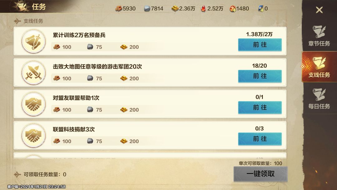 支线任务:多环累计式任务,每完成一项任务即可获得相应资源奖励,同时会解锁下一环支线任务。