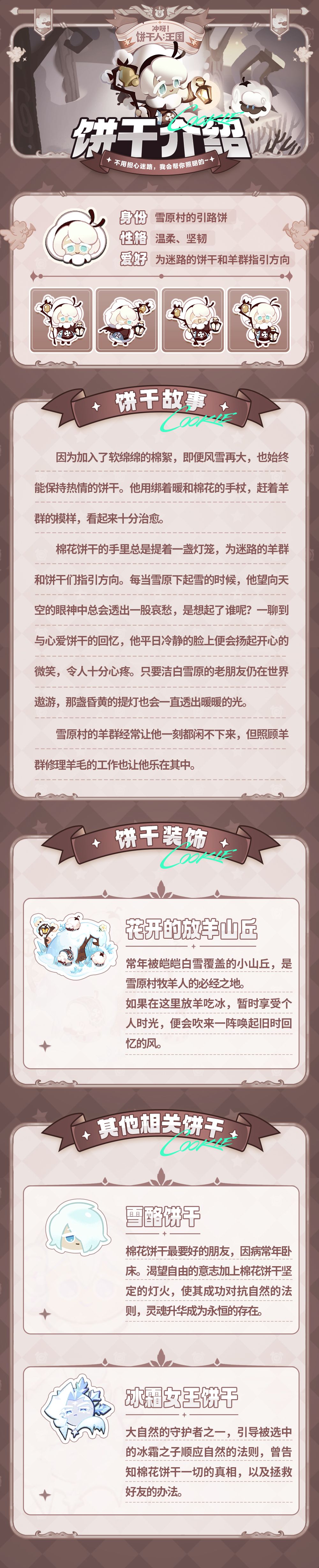 因为加入了软绵绵的棉絮,即便风雪再大,也始终能保持热情的饼干。每当雪原下起雪的时候,他望向天空的眼神中总会透出一股哀愁,是想起了谁呢?一聊到与心爱饼干的回忆,他平日冷静的脸上便会扬起开心的微笑,令饼十分心疼。只要洁白雪原的老朋友仍在世界遨游,那盏昏黄的提灯也会一直透出暖暖的光。