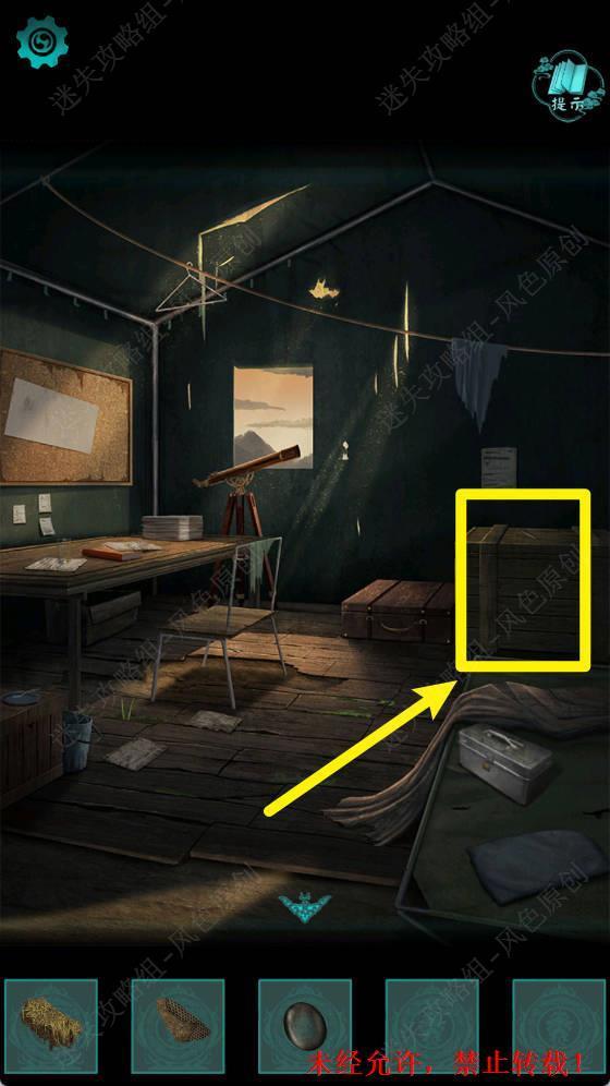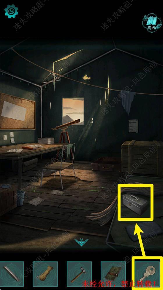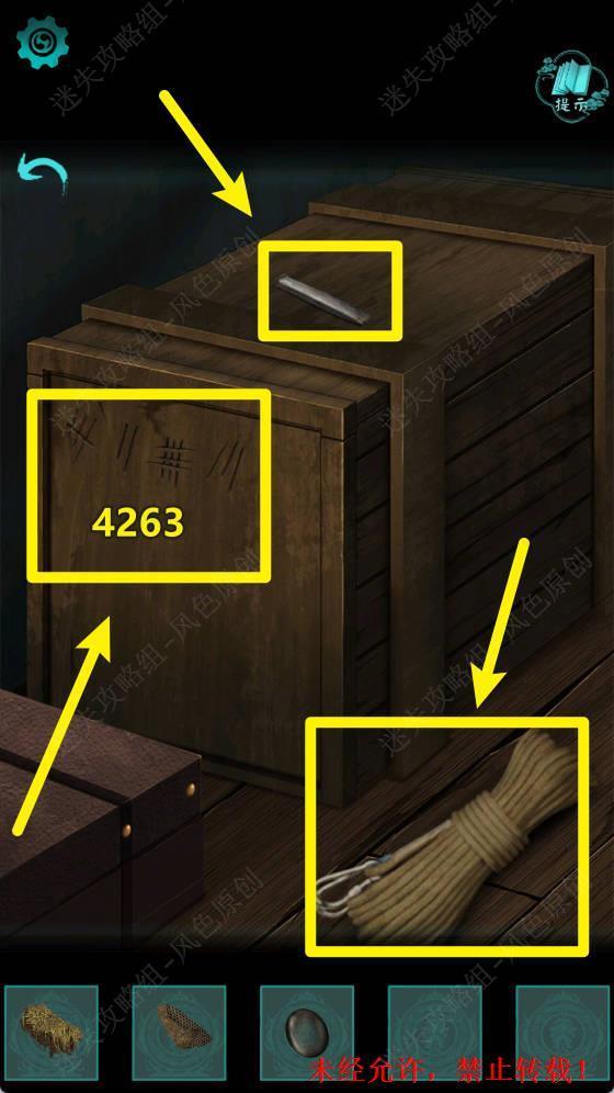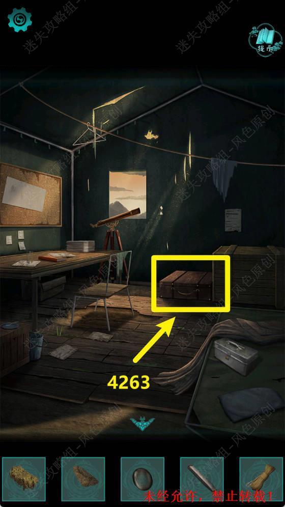 11.输入密码4263打开下图箱子,在箱子内点击获取【锤子】,【指南针】和【笔记本】。 11