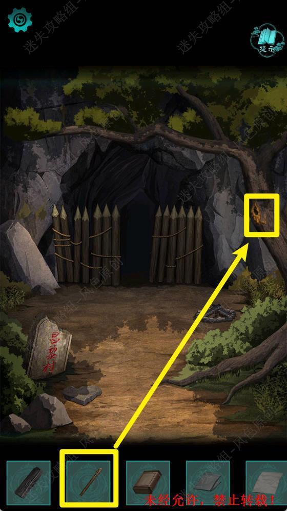 43.切换场景,对树上所示位置使用【木棒】,获取【火把】。 43