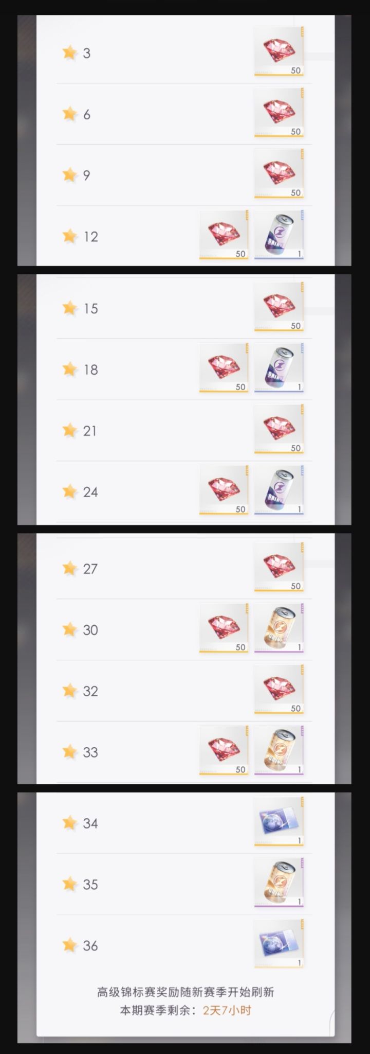 今天终于打完中级锦标赛可以去高级锦标赛瞅一眼了,建议大家都尽快打完初级和中级,然后去尝试高级,高级锦标赛的奖励是会按赛季刷新的,这个赛季还有两天多就要结束(今天是1月26日星期五),应该是在这个周天晚上12点结束(以两周为周期刷新,周日晚上12点截止,凌晨0点到5点是结算时间无法参与打不了),锦标赛打完36颗星可以拿到600钻+2普抽+3大体力+3中体力,加上首通奖励20×12有240钻(即使没有星高级锦标赛每一关只要通过都有首通的奖励)