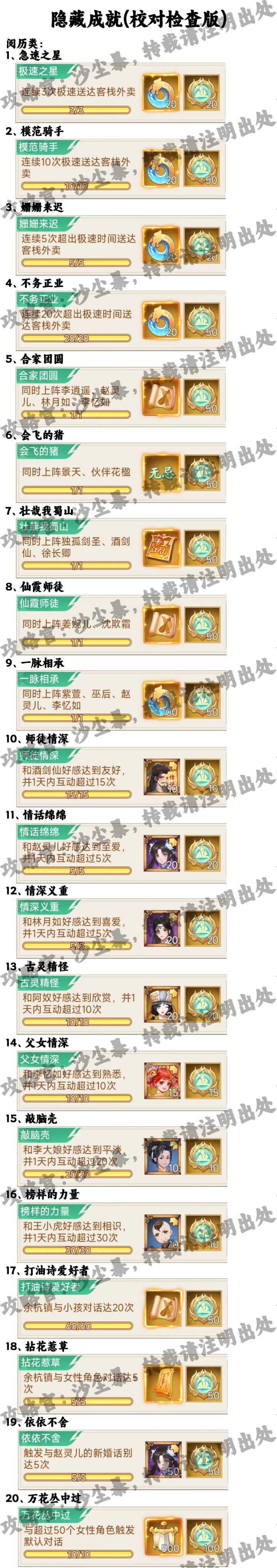 目前游戏已知的隐藏成就比较多,有的玩家会不确定自己还有哪些成就没完成,这里将目前已知的所有成就都写出来,让玩家可以进行检查