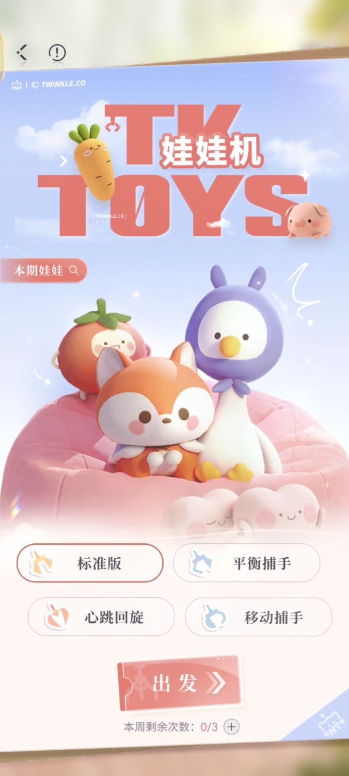 娃娃机有4个模式,分别是标准版、平衡捕手、心跳回旋、移动捕手。这些本质上并无具体的难度区分,只要找准方法基本上都可以抓到,但是如果按照判定来分,我倒是觉得回旋是最容易的,因为娃娃躺平的姿势很好抓。