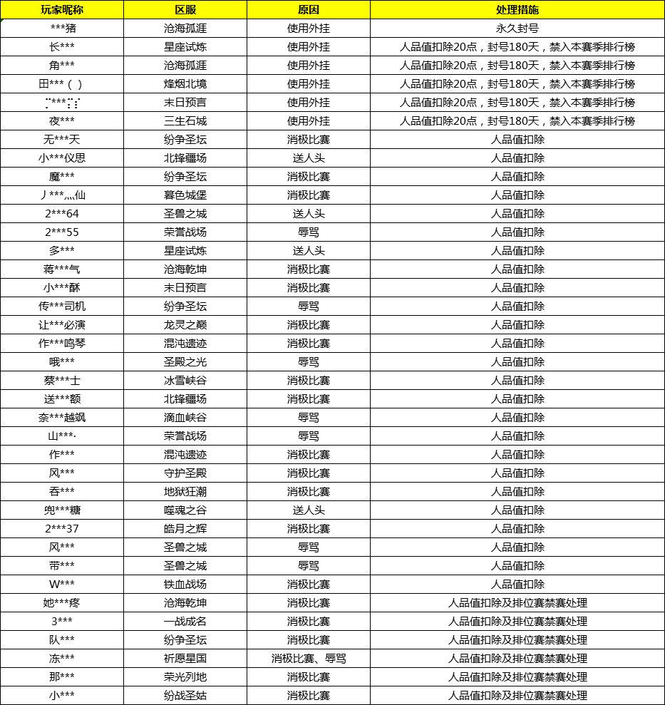 以下为本周违规玩家处罚名单