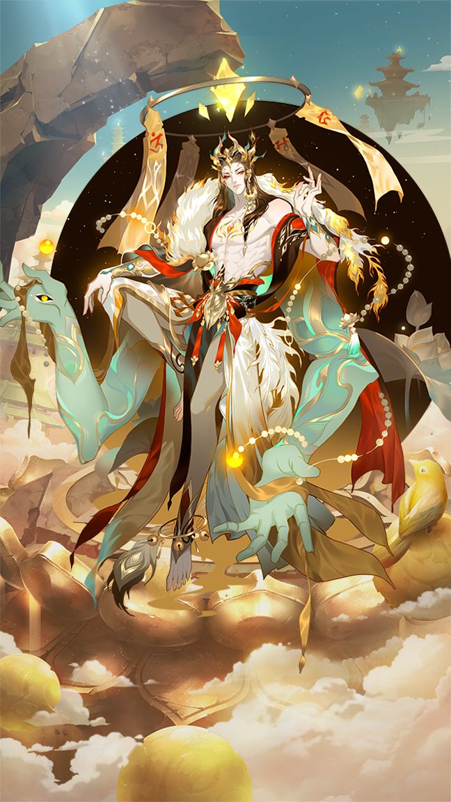 孔雀明王,佛界领袖之一,毗卢遮那如来忿怖相。擅驱邪毒恶疾,能身化多臂,虽是明王却现慈悲相。神器众多,以莲华、俱缘、吉祥、孔雀尾最为人知。传世《孔雀明王经》,颂之可除害息灾。