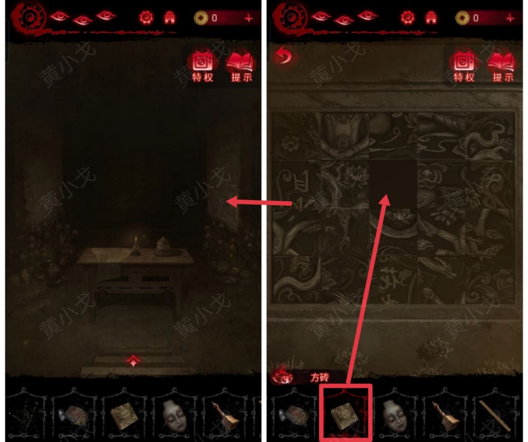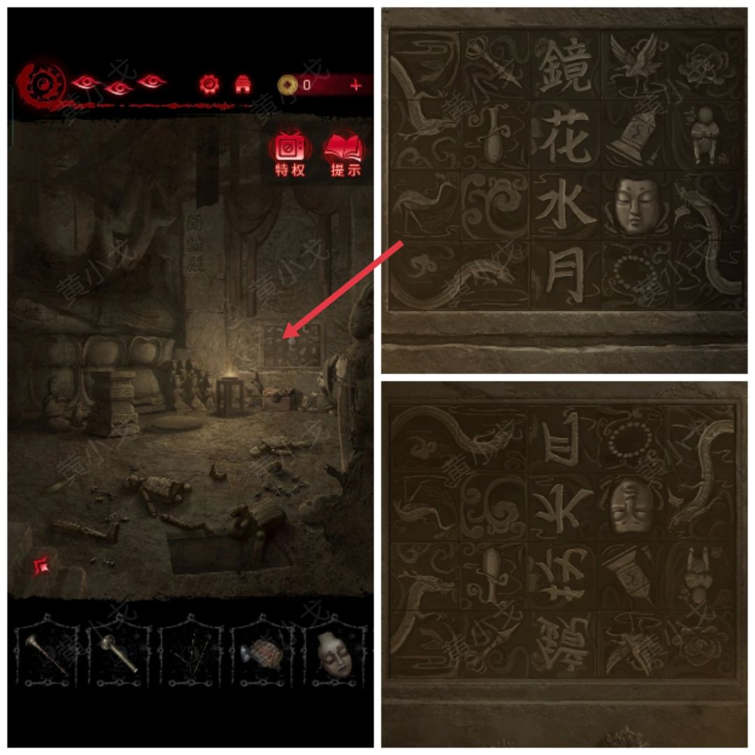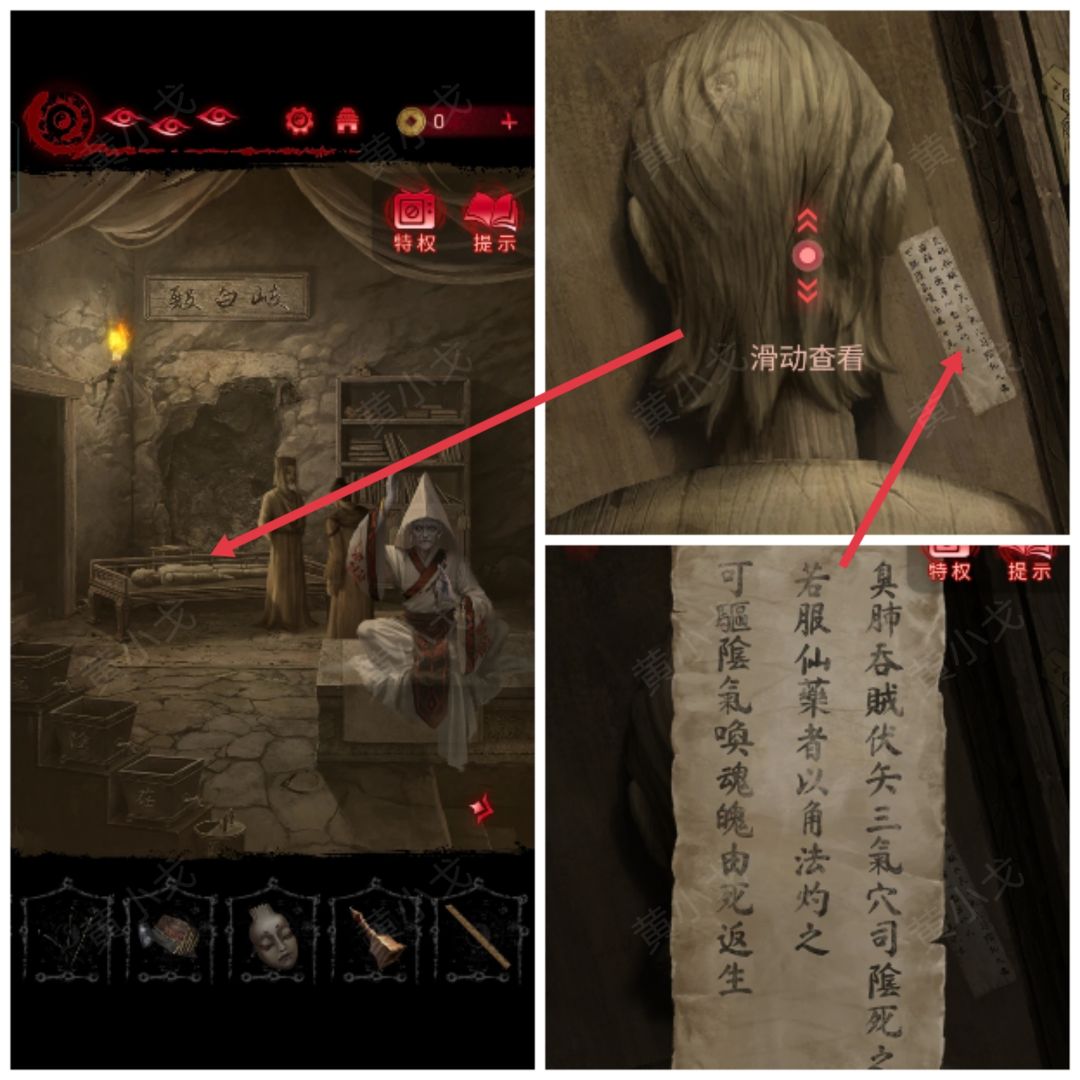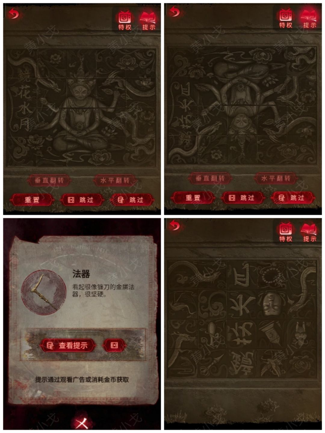 22.完成小游戏,获得线索(镜花水月);重新完成拼图,这次要倒过来(垂直翻转)(其间蜡烛会熄灭,再去桌子那里用火镰点燃蜡烛就好),获得【法器】;蜡烛又被熄灭,点燃蜡烛后快速查看右边的浮雕墙,有个小鬼会吹灭蜡烛
