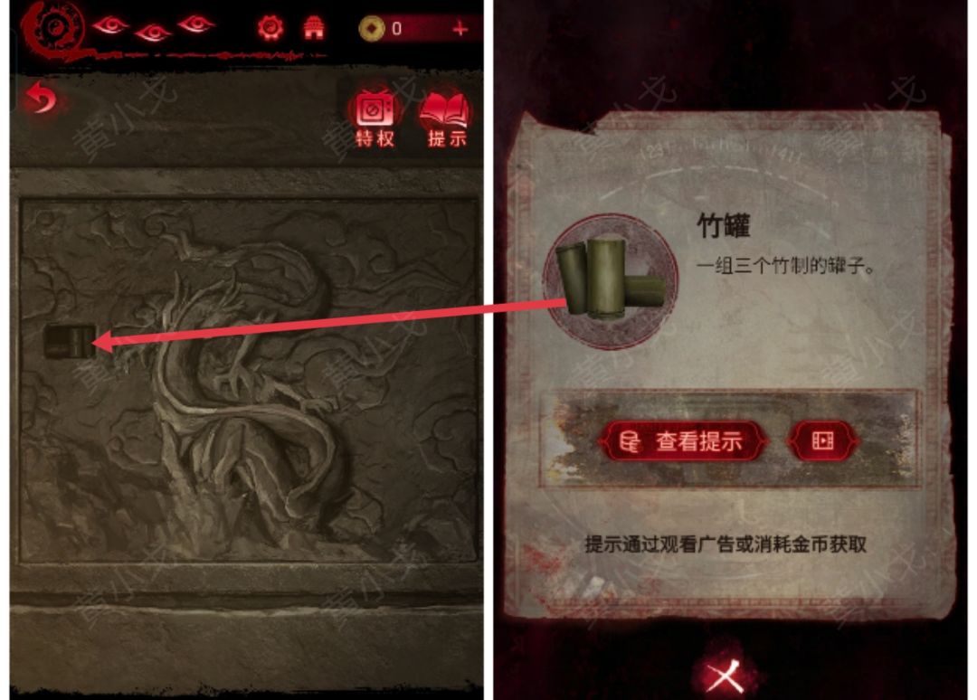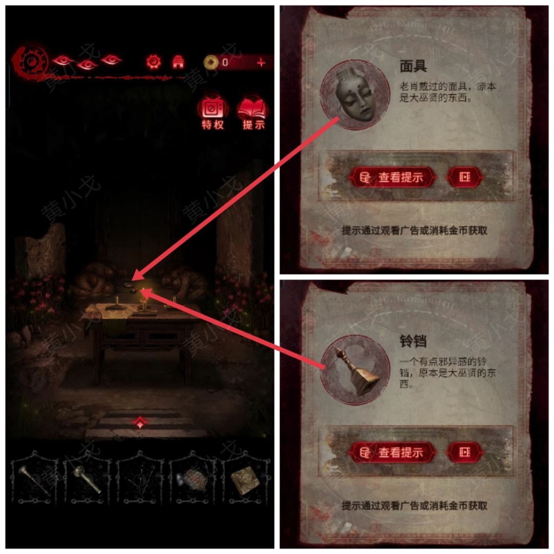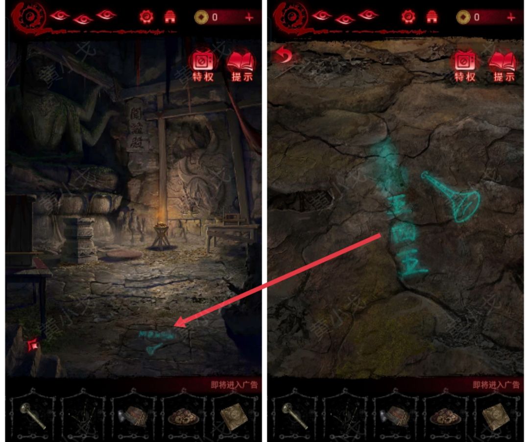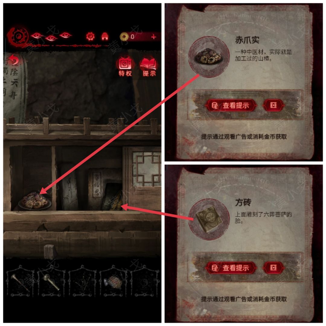 22.完成小游戏,获得线索(镜花水月);重新完成拼图,这次要倒过来(垂直翻转)(其间蜡烛会熄灭,再去桌子那里用火镰点燃蜡烛就好),获得【法器】;蜡烛又被熄灭,点燃蜡烛后快速查看右边的浮雕墙,有个小鬼会吹灭蜡烛