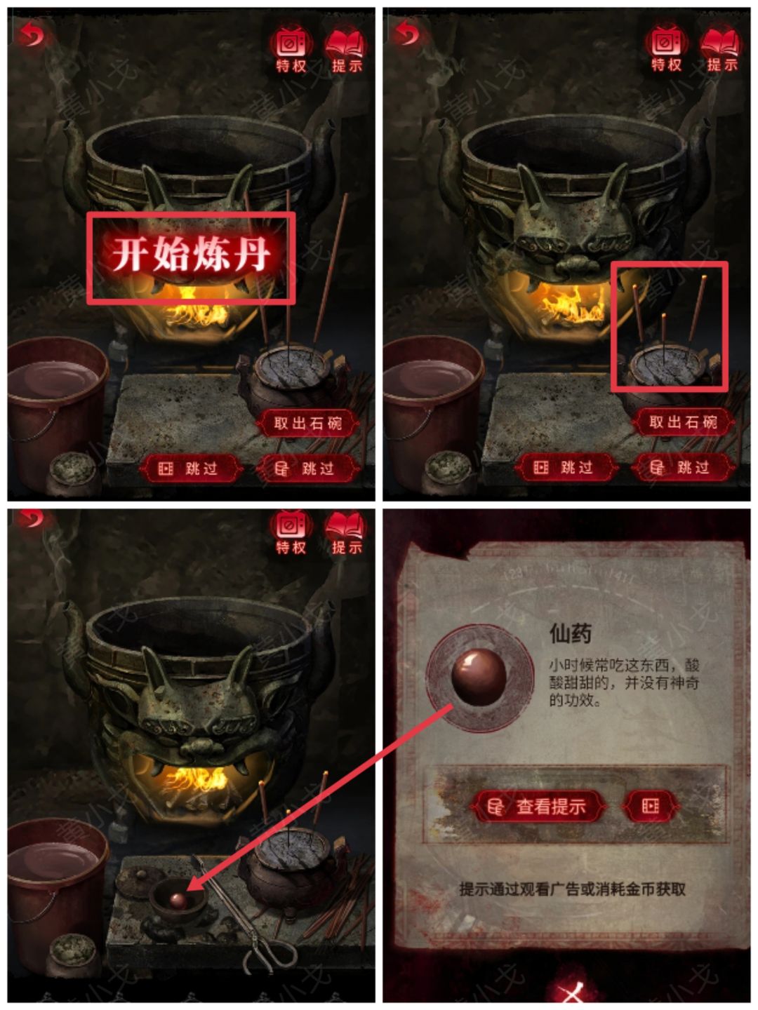 28.完成小游戏(点击燃烧三根香,调整炼丹时间为一炷香),获得【仙药】