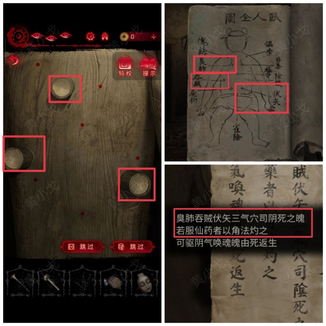 31.根据纸条上的线索和《岐黄葬草经》上的线索,把竹罐放到正确的穴位上(臭肺、吞賊、伏矢),触发剧情
