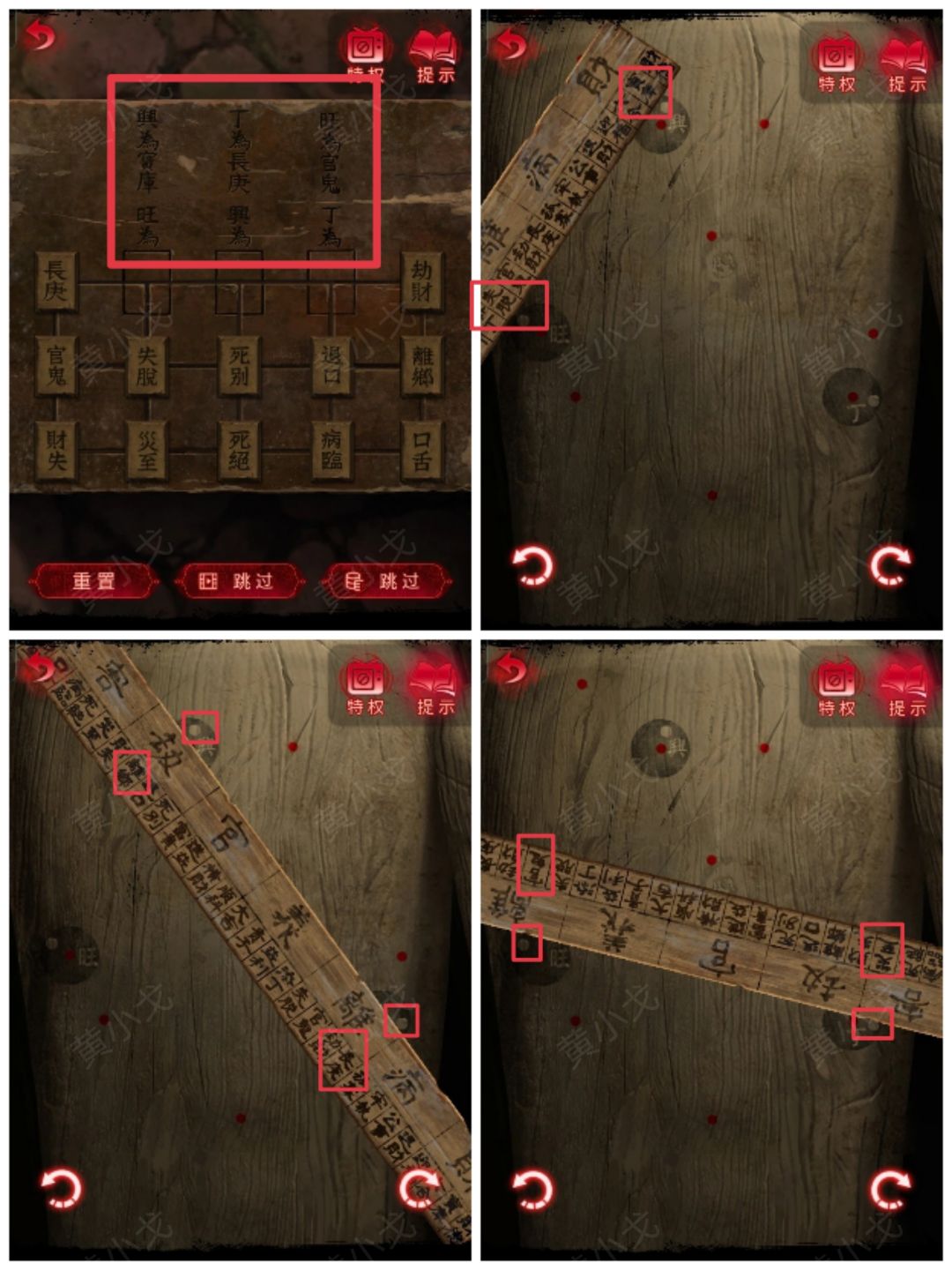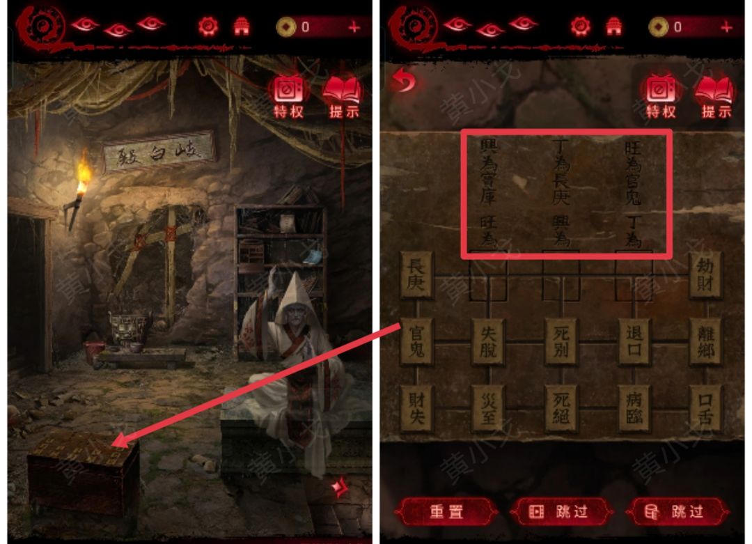 5.点击地上的箱子,注意上面的刻字(兴为宝库,旺为…、丁为长庚,兴为…、旺为官鬼,丁为…)