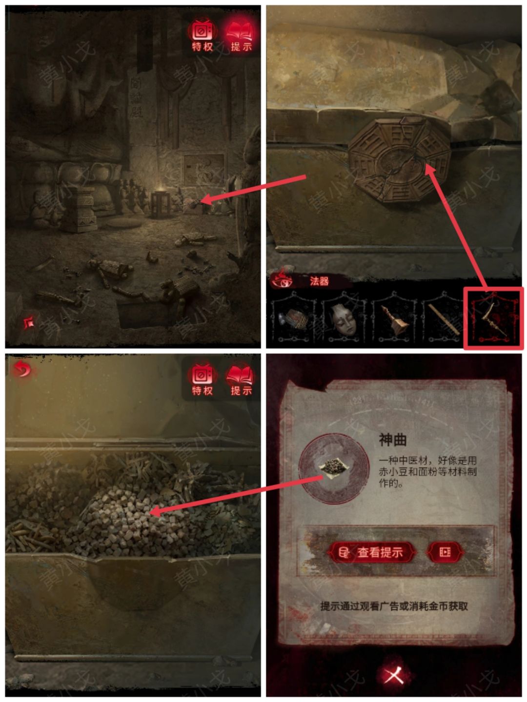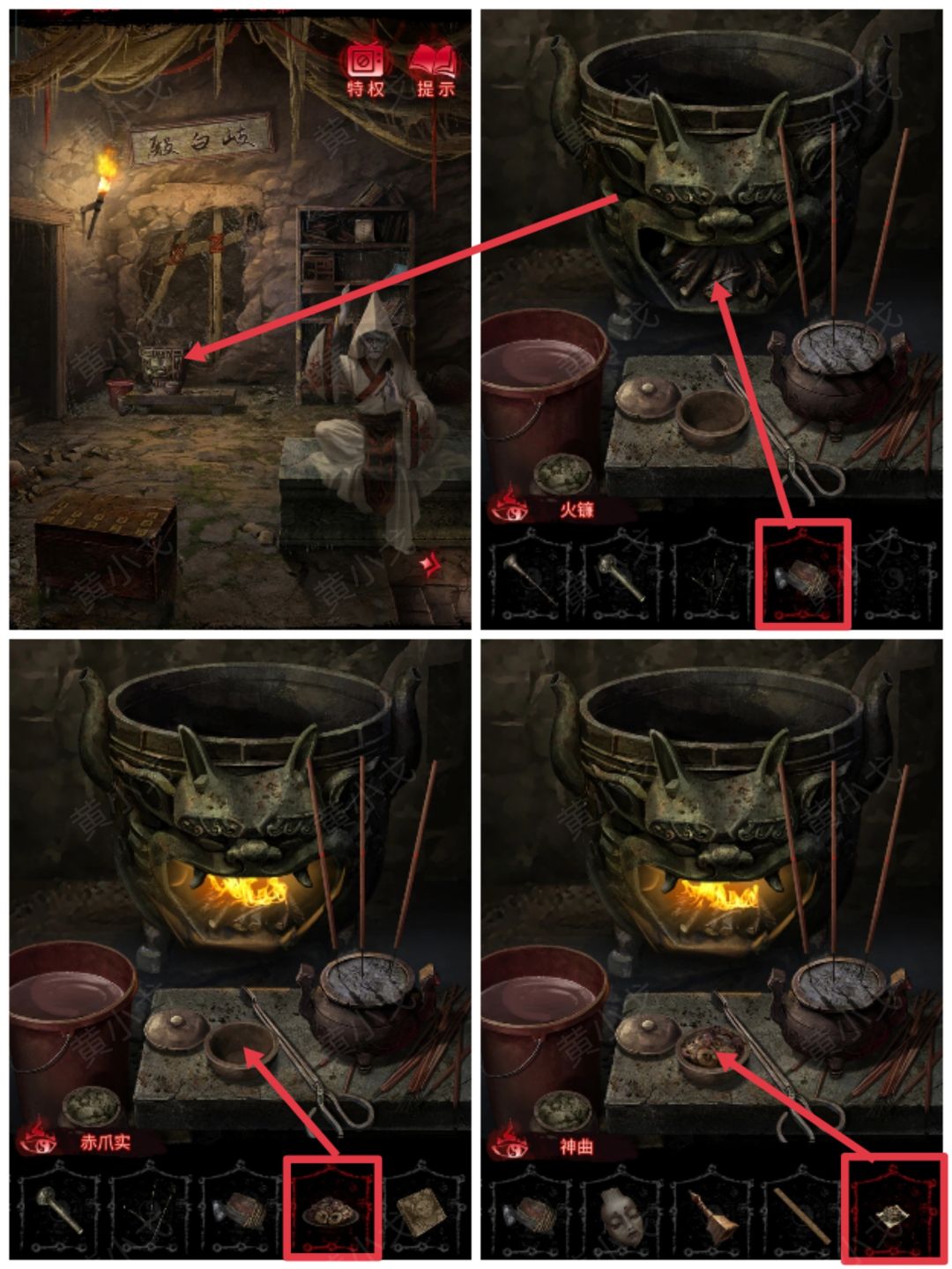 26.(现代-岐白殿)点击药炉,用【火镰】点燃木材,把【赤爪实】和【神曲】放入陶碗中(此步骤依据《黄白葬丹经》上的线索)