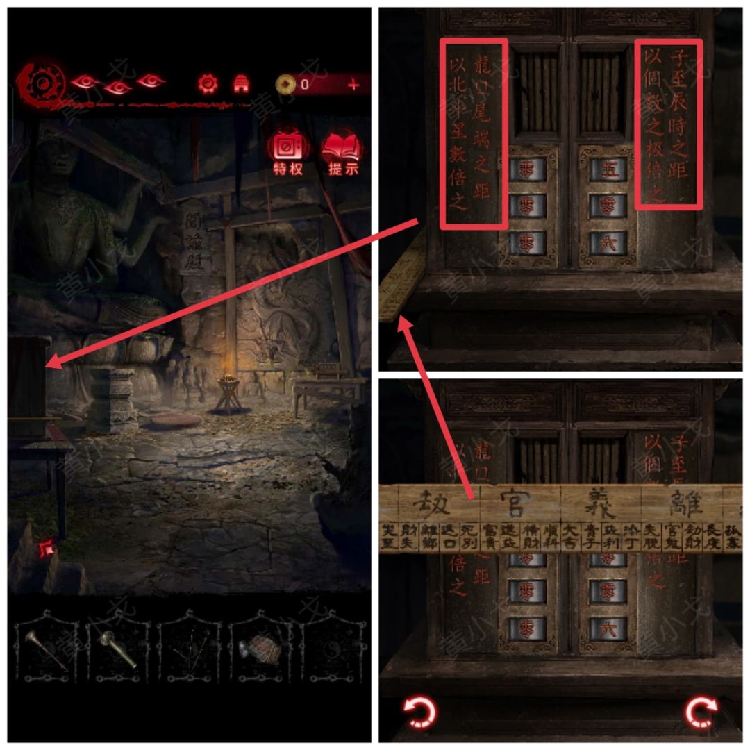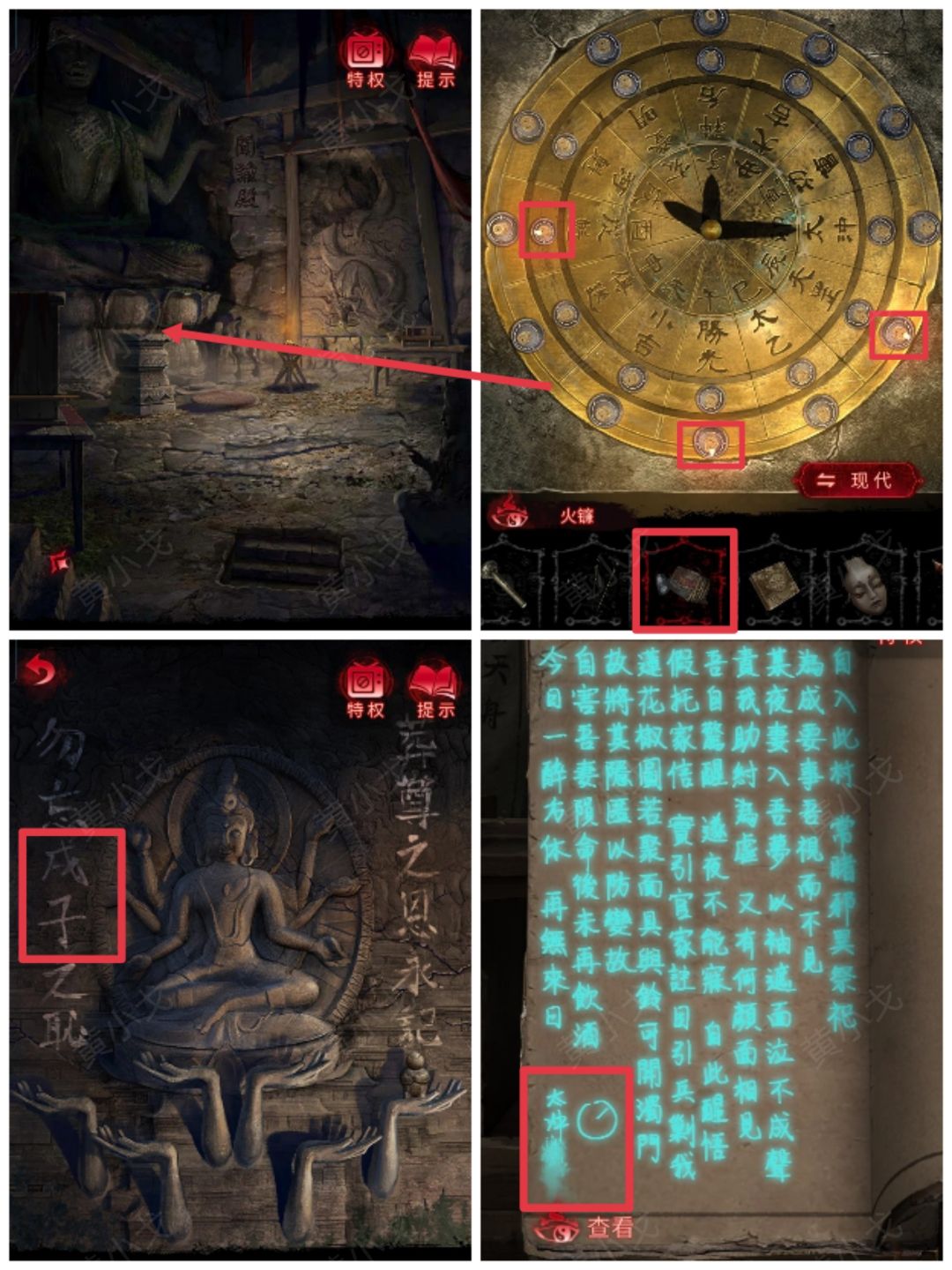 19.(现代-闻谕殿)点击宙晷盘,根据《肖》上的线索(太冲和图案),结合密室浮雕上的线索(戌子),用【火镰】点燃对应的蜡烛(使影子对准太冲、戌、子),触发剧情,转换时空到唐朝