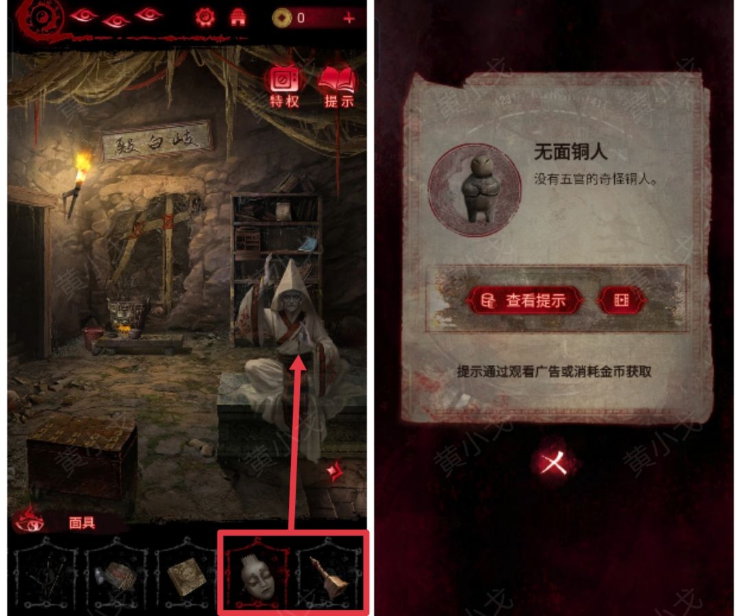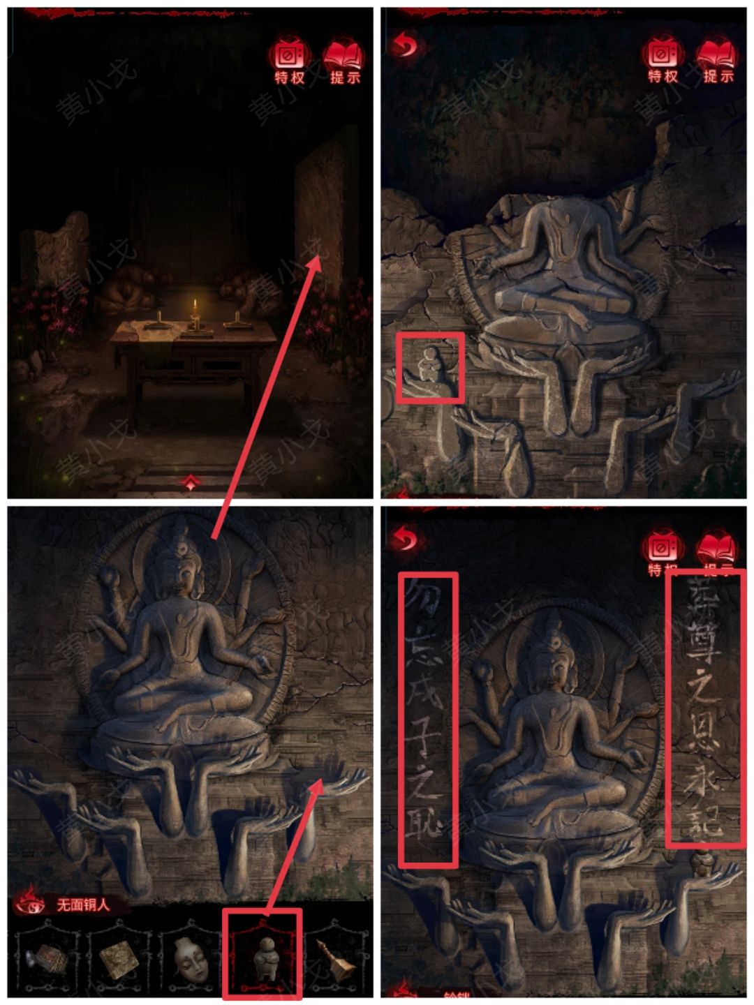18.点击右边的浮雕墙,根据左边浮雕墙上的提示,把【无面铜人】放到正确的位置上,获得线索(葬尊之恩永记,勿忘戌子之耻)
