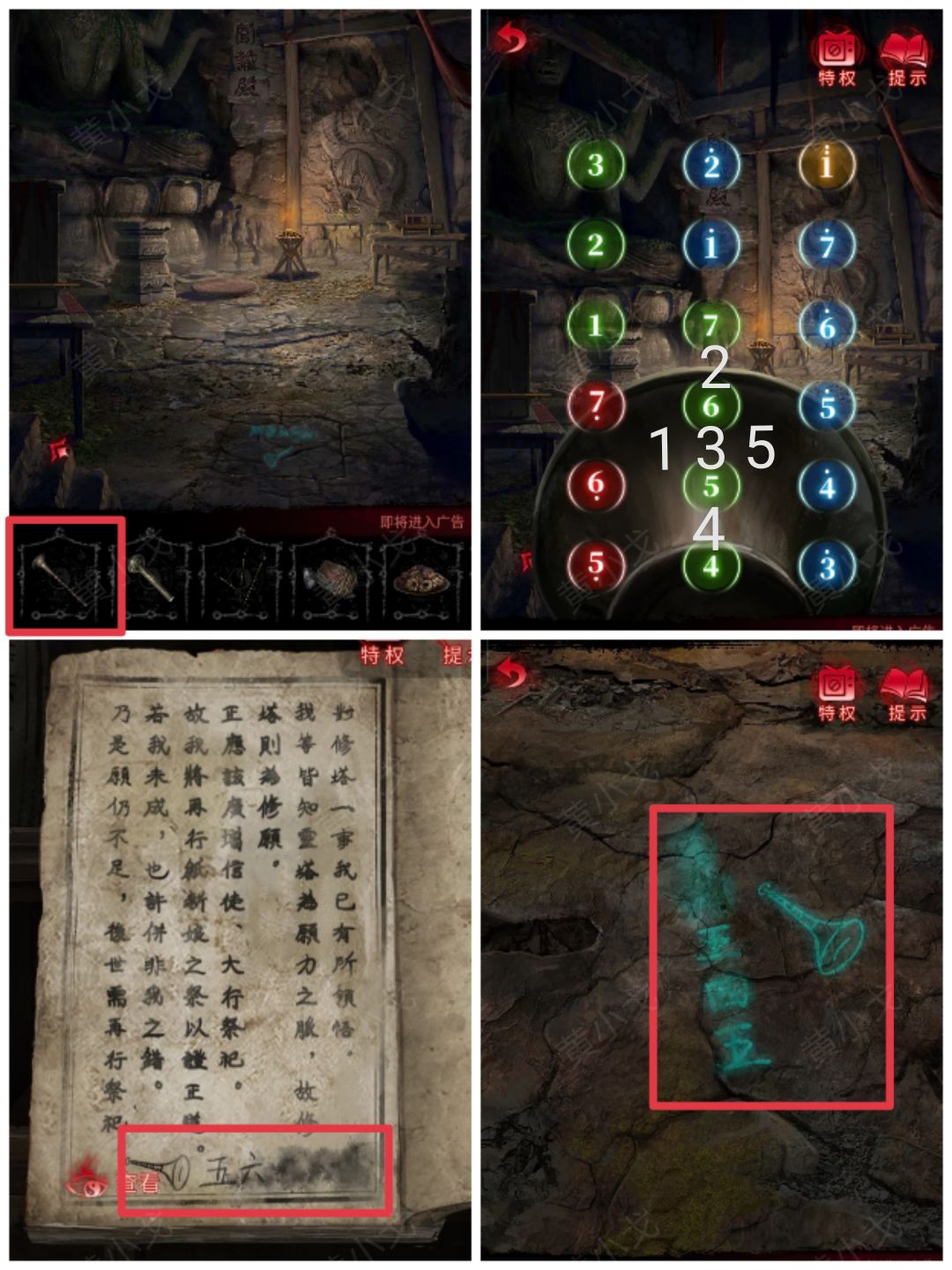 13.拿出【唢呐】,根据《灵塔思》上的线索(五六***),结合地面上的字(**五四五),按顺序按下音符(绿色的:五六五四五),打开浊门殿的门