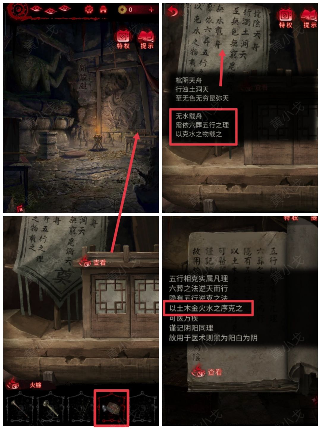 8.点击桌子上的模型船,根据布上的提示(需以克水之物载船),结合《岐黄葬草经》上的线索(以土木金火水之序克之),使用【火镰】