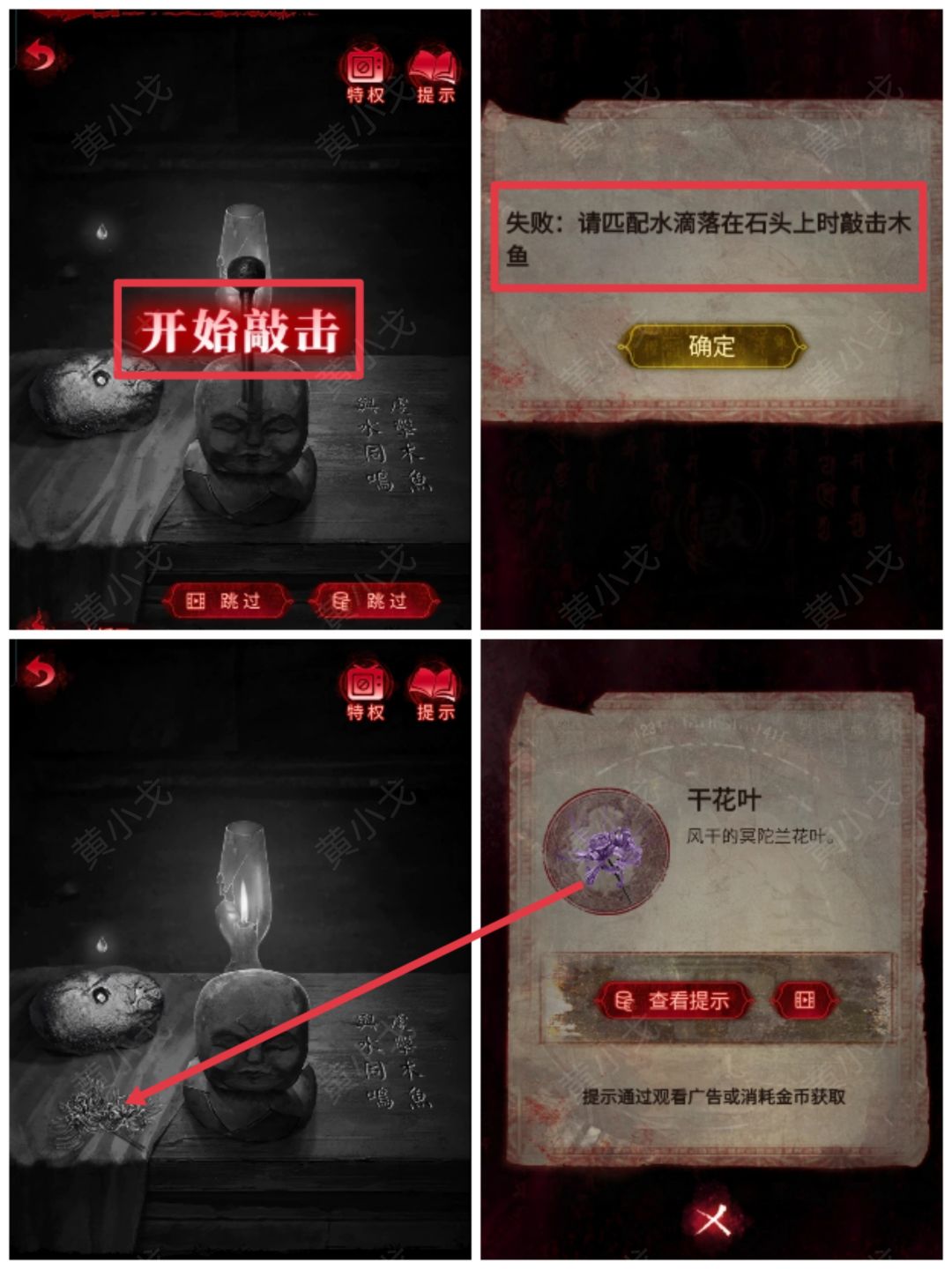 10.完成小游戏(在水滴落在石头上时敲击木鱼);获得【干花叶】