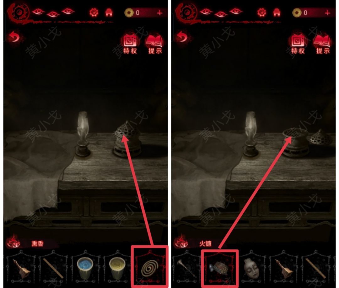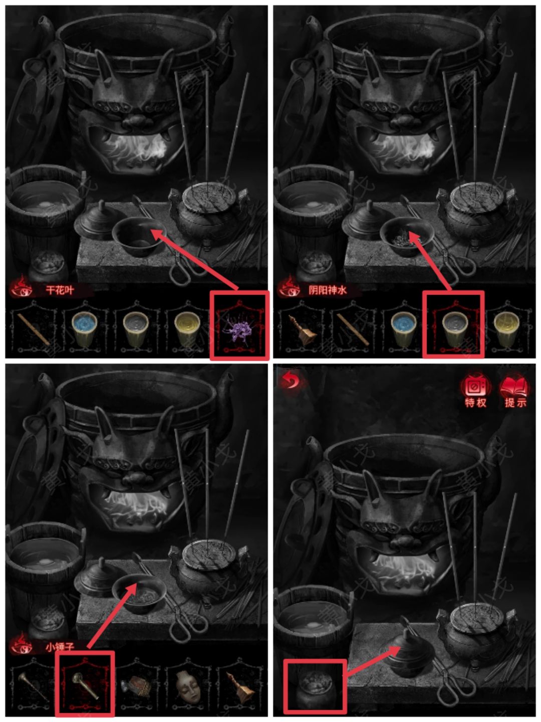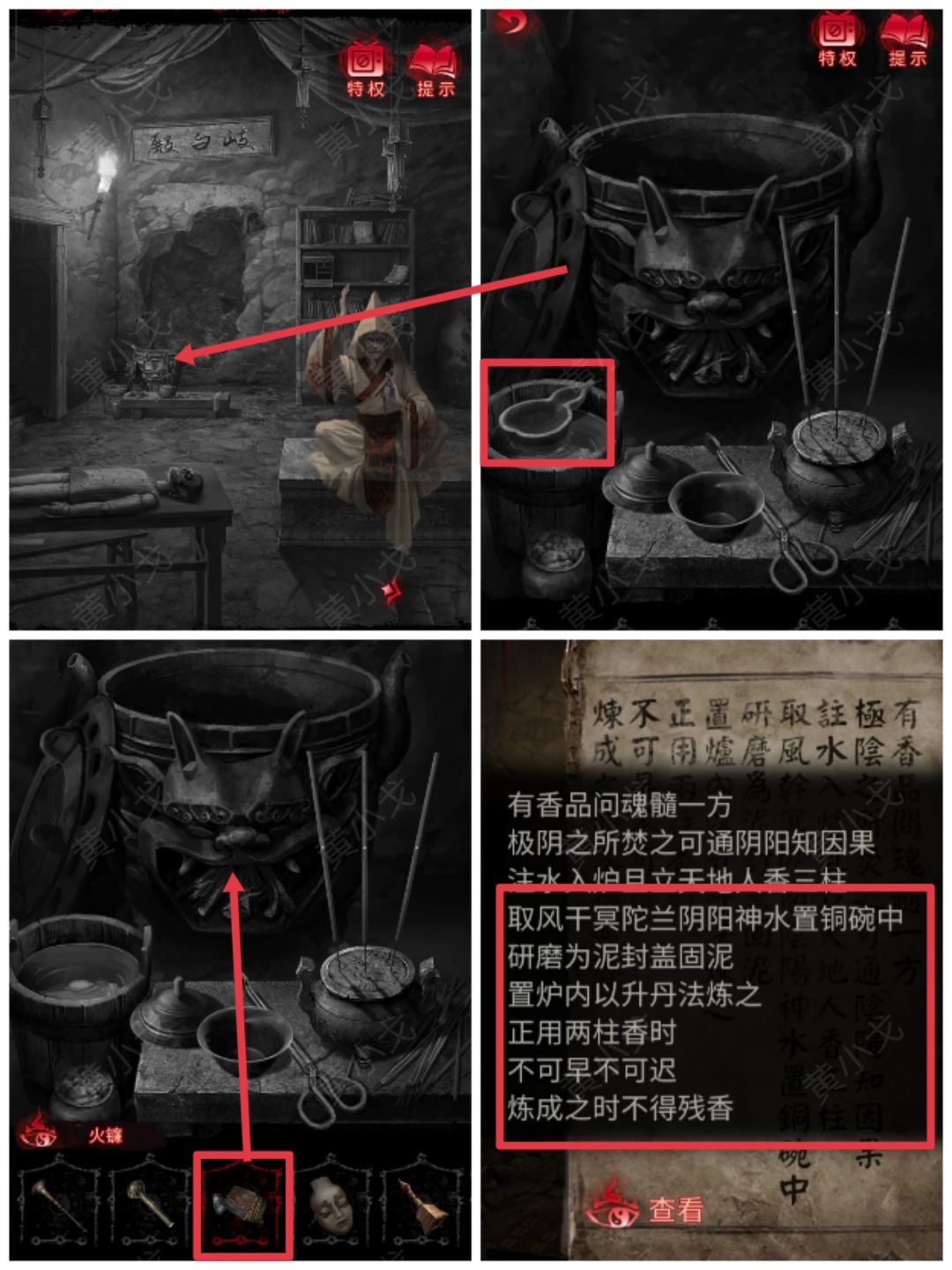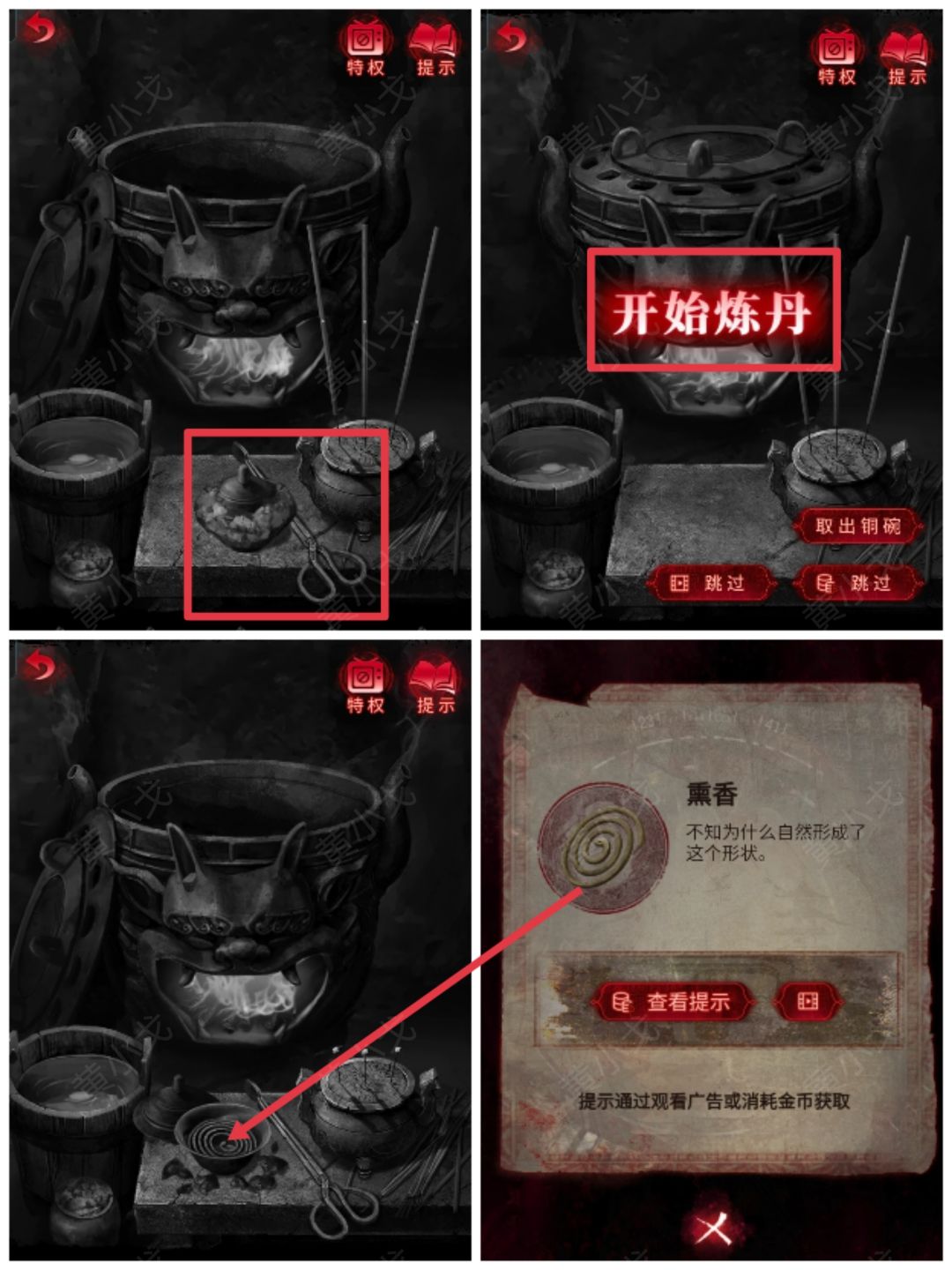 13.用钳子把陶碗放入药炉中,完成小游戏(正用两炷香);获得【熏香】