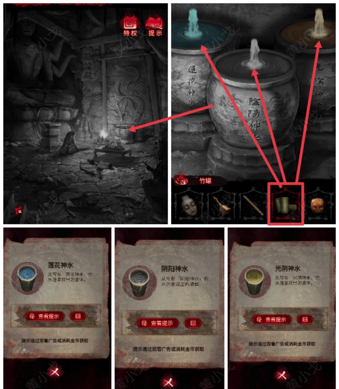 7.(民国-闻谕殿)点击水缸,用【竹罐】装【莲花神水】、【阴阳神水】和【光阴神水】,触发剧情