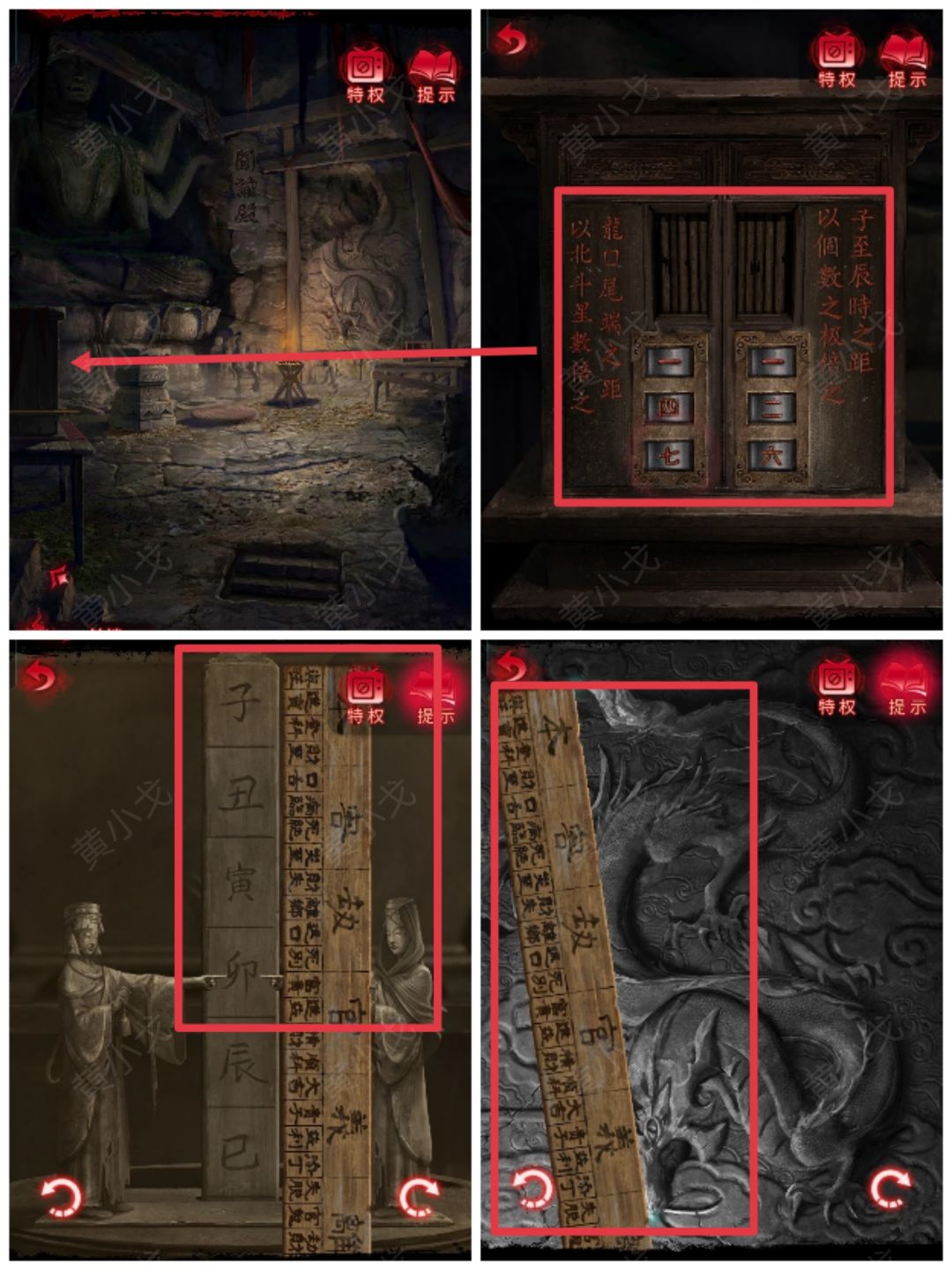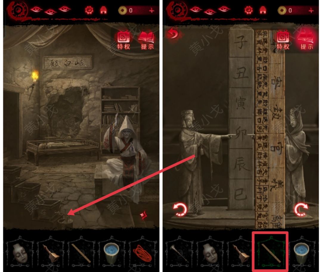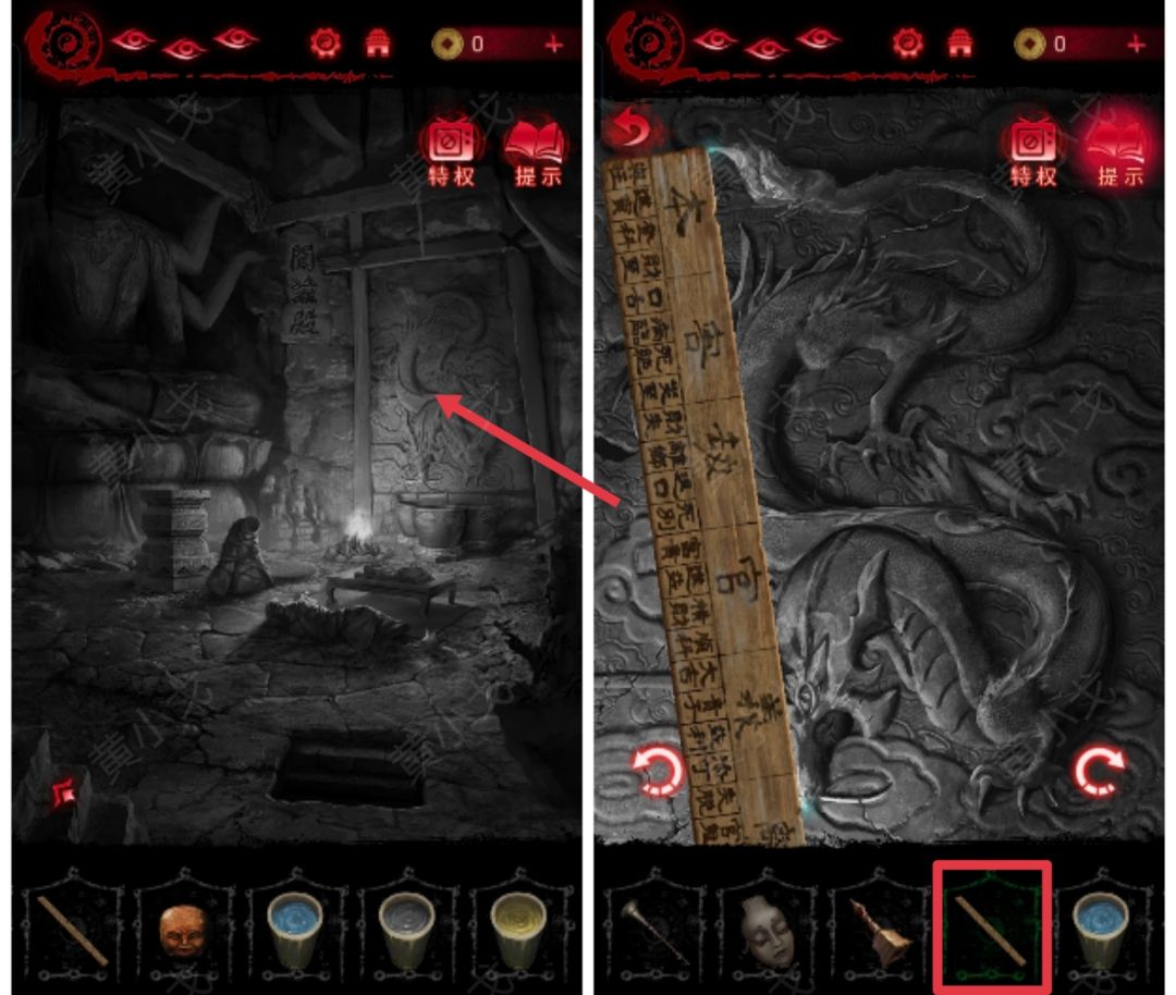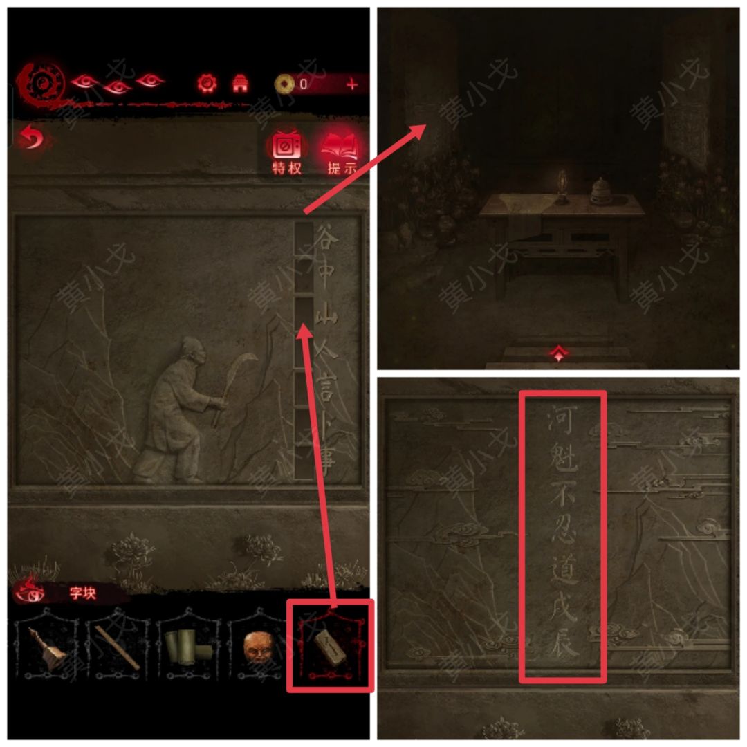 5.点击左边的浮雕墙,把【字块】嵌入山字旁边的凹槽,获得线索(河魁不忍道戌辰)