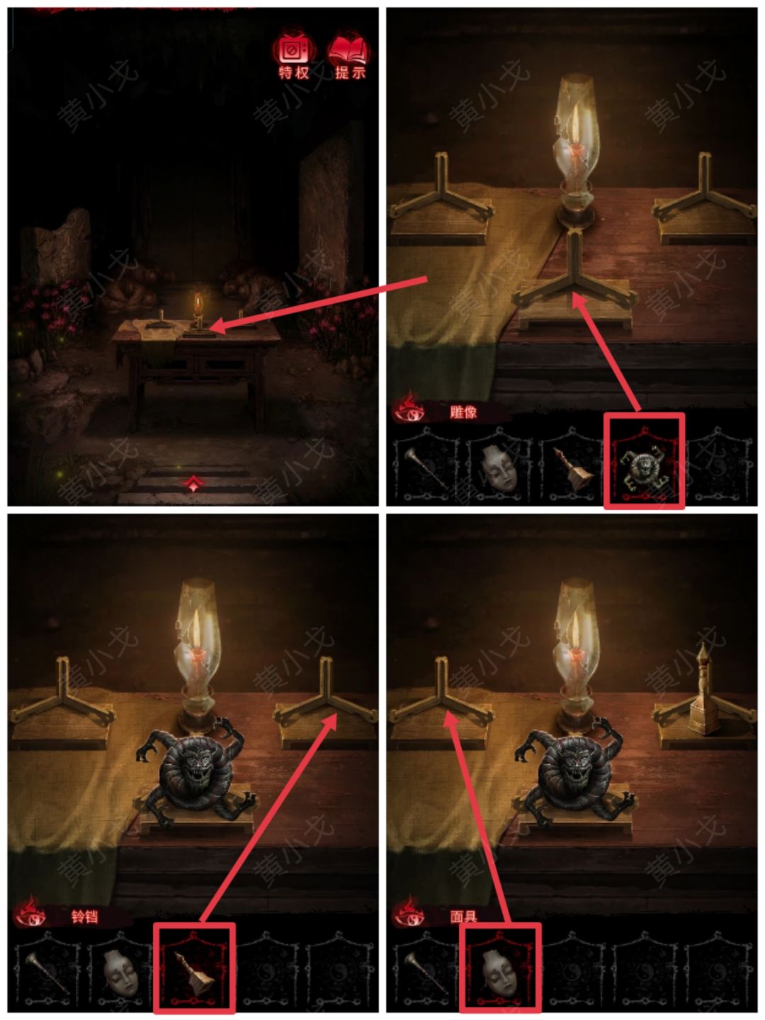 24.(现代-浊门殿)点击桌子,把【雕像】、【铃铛】和【面具】放到小架子上,触发剧情,打开浊门