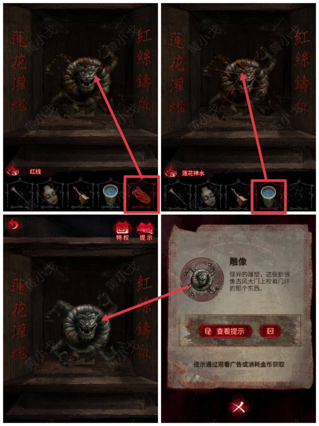23.打开神龛的门,给雕像绑上【红线】,淋上【莲花神水】,获得【雕像】