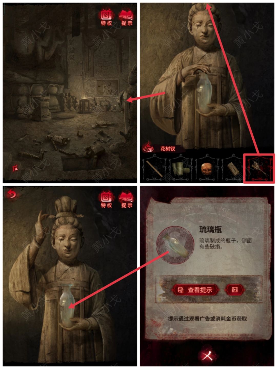 3.(唐朝-闻谕殿)点击石雕,把【花树钗】插入她头上,获得【琉璃瓶】