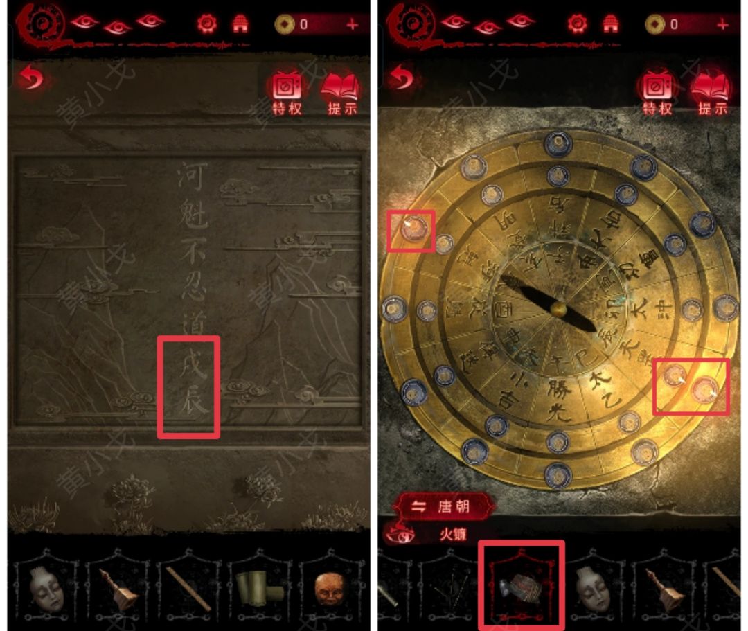6.(唐朝-闻谕殿)点击宙晷盘,根据浊门殿浮雕墙上的线索,用【火镰】点燃对应的蜡烛(使影子对准戌、辰),触发剧情,转换时空到民国