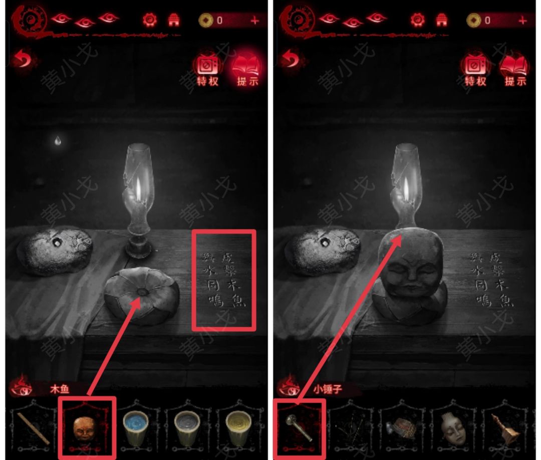 9.(民国-浊门殿)点击桌子,根据桌面上的提示(虔击木鱼,与水同鸣),把【木鱼】放到小垫子上,使用【小锤子】
