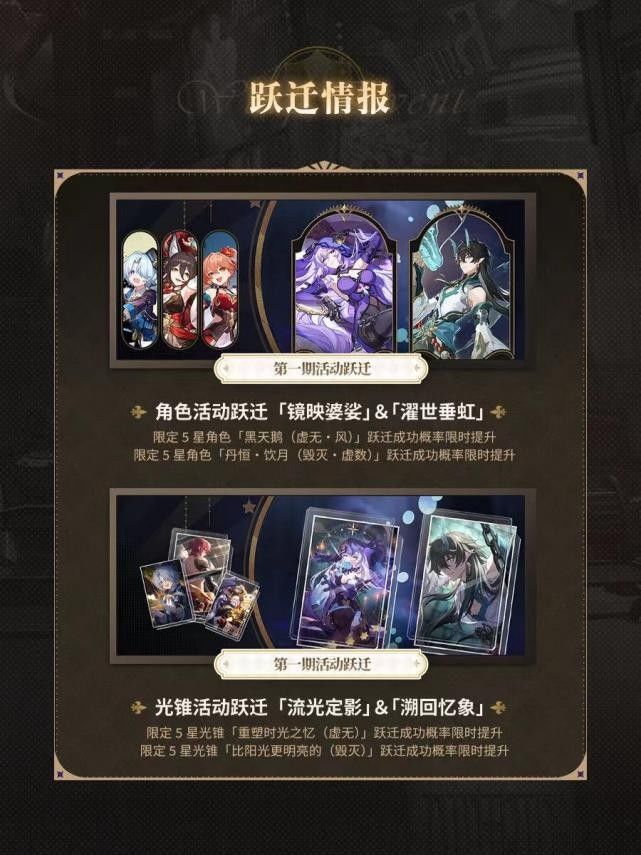 下半:新5星角色花火+景元,4星角色桑博+青雀+寒鸦新角色花火,作为继布洛妮娅之后的第一个五星同协角色,但从外表就让人无法抗拒,更何况实用性绝对不低。至于景元,往事不堪回首,过去的就让他过去吧,不过专属光锥拂晓之前倒是值得一抽