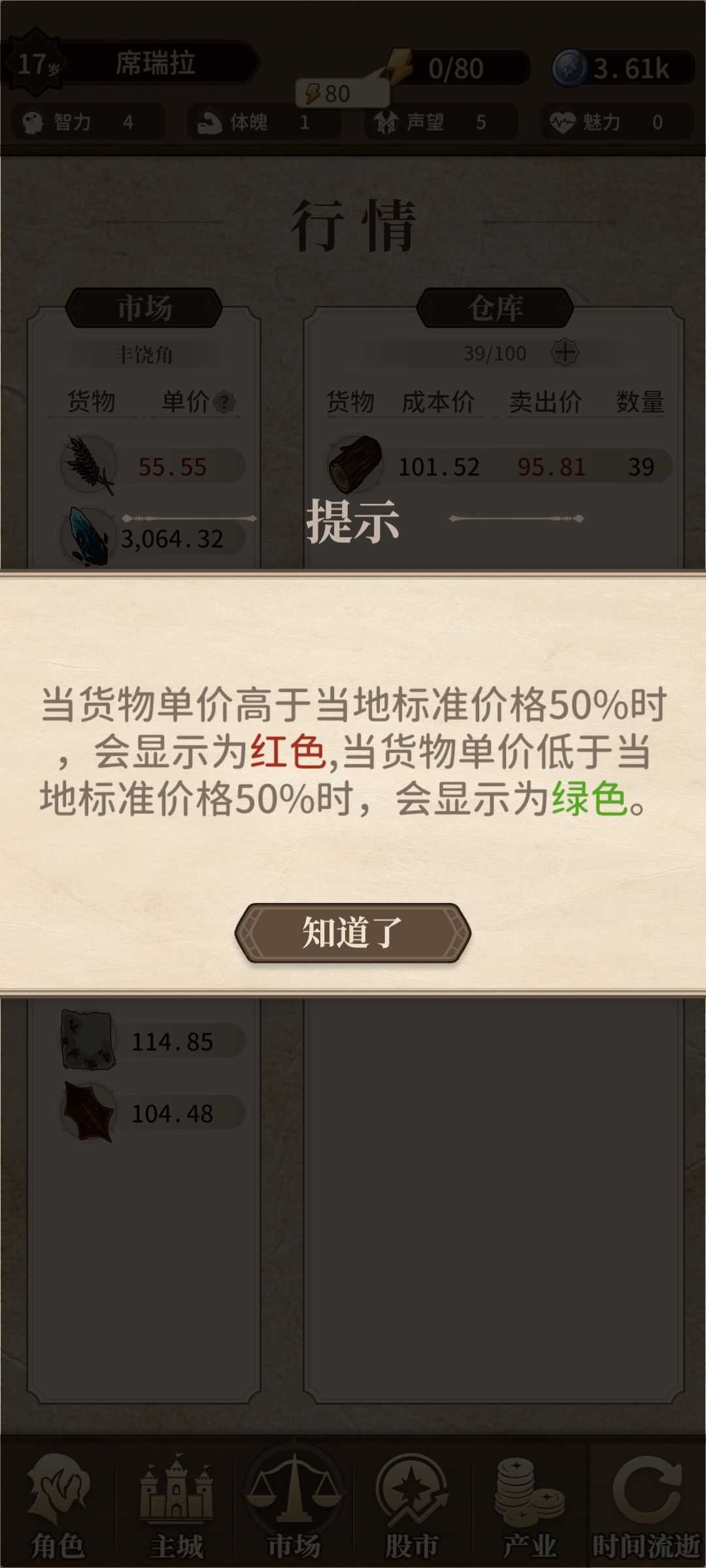 3.市场,利用城市间的差价(通过情报和实地走访获取),进行物资倒卖,高价值货物需要城市贡献度解锁(通过产业,好感度,买卖货物等方式提升贡献度),当回合当城买的不能卖,主要盈利手段。